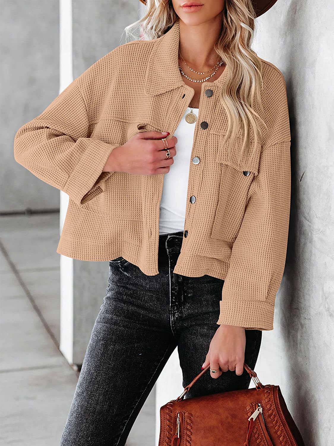 ANRABESS Women Waffle Knit Cropped Shacket Shirt Long Sleeve Collared Button Down Pockets Thermal Jacket Coat