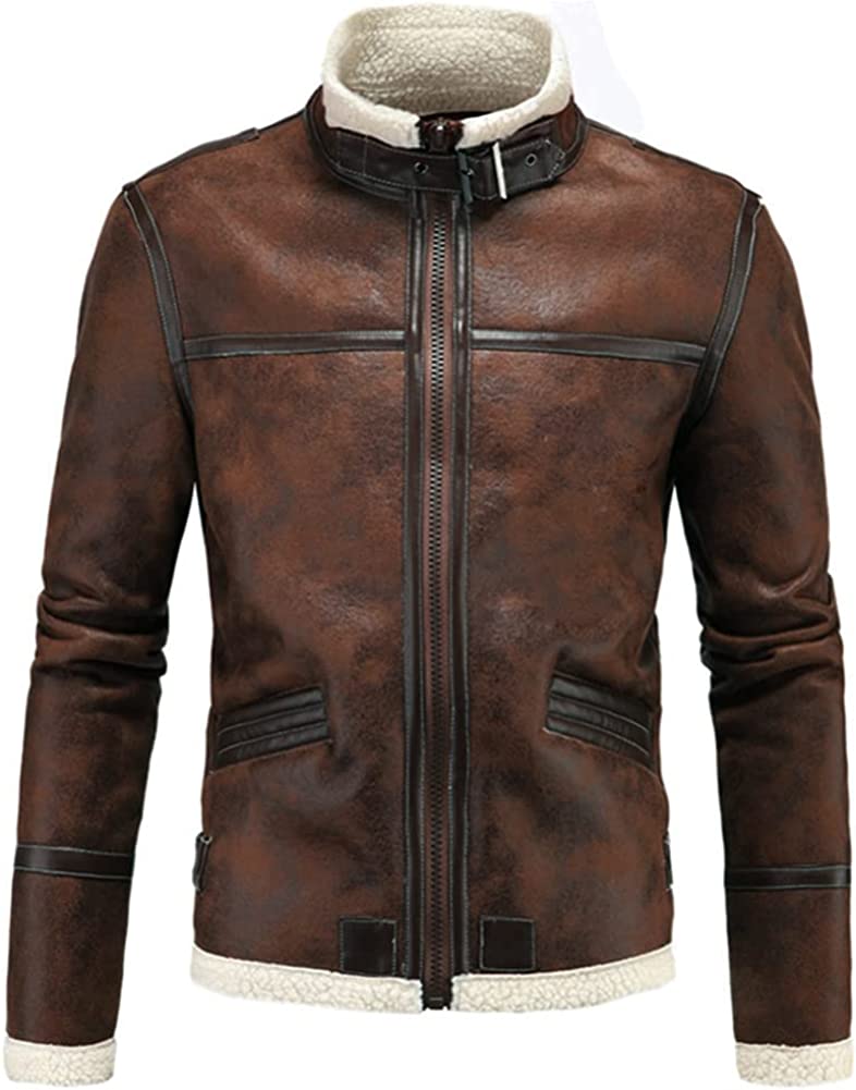 AOWOFS Men's Faux Leather Jacket Brown Motorcycle Bomber Shearling Suede Stand Collar