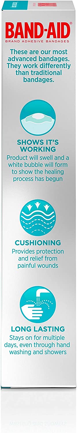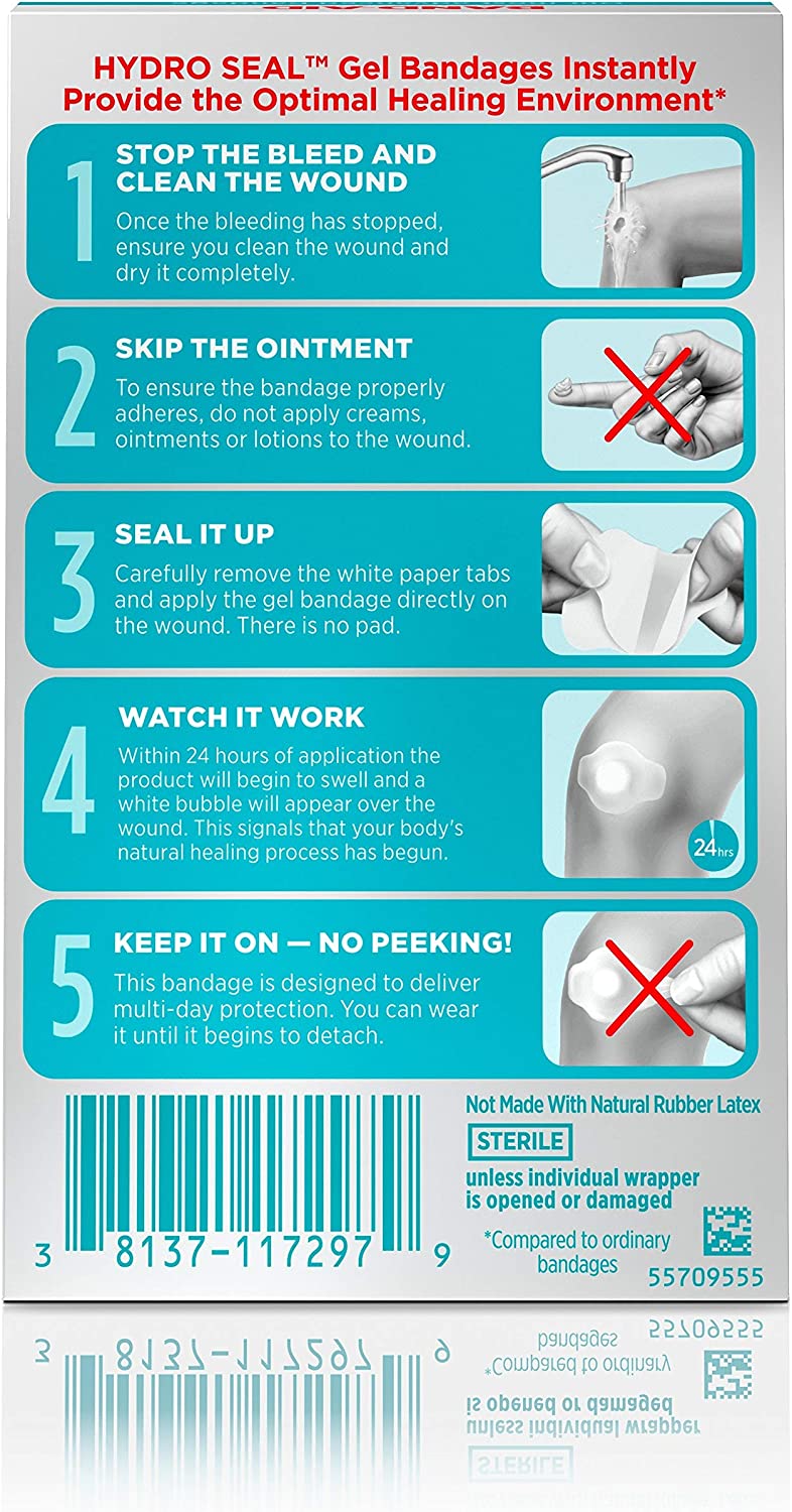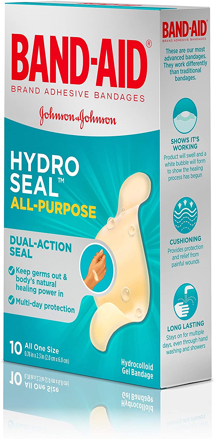 Band-Aid Brand Hydro Seal All Purpose Bandages help keep germs out and your body's natural healing power in. Within 24 hours of application, a white bubble will form under the bandage to show that the healing process has begun. These waterproof bandages provide advanced wound care and cushion to help protect blisters. Cushioning provides protection and relief from painful blisters and wounds. Ideal for use on all parts of the body, the bandages deliver multiday protection and stay on even through hand washing and showers. Band-Aid Brand Hydro Seal All Purpose Bandages are sterile and not made with natural rubber latex. This package contains 10 individually wrapped Gel Bandages, each measuring 0.78 by 2.3 inches.