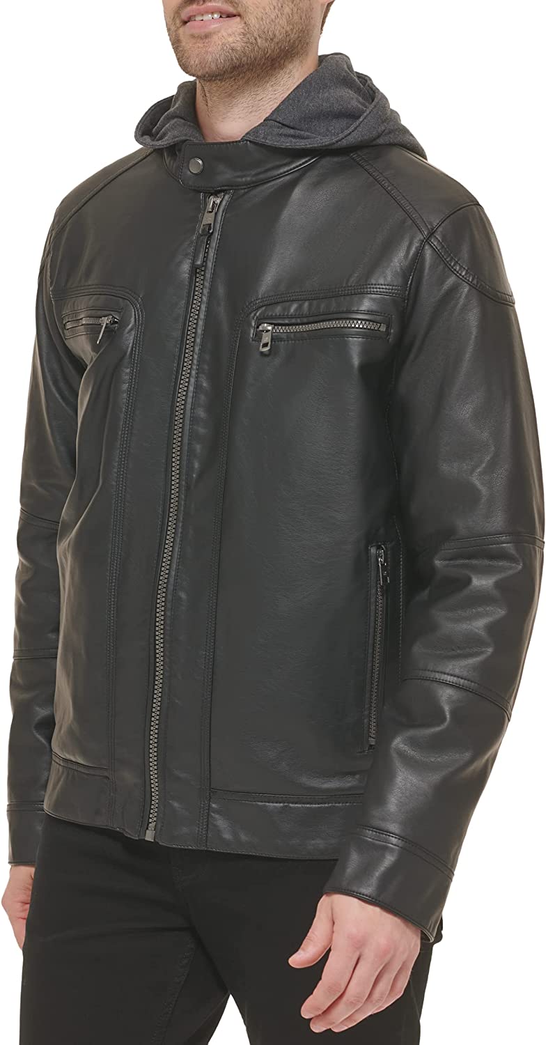 Calvin Klein Men's Faux Lamb Leather Moto Jacket with Removable Hood and Bib