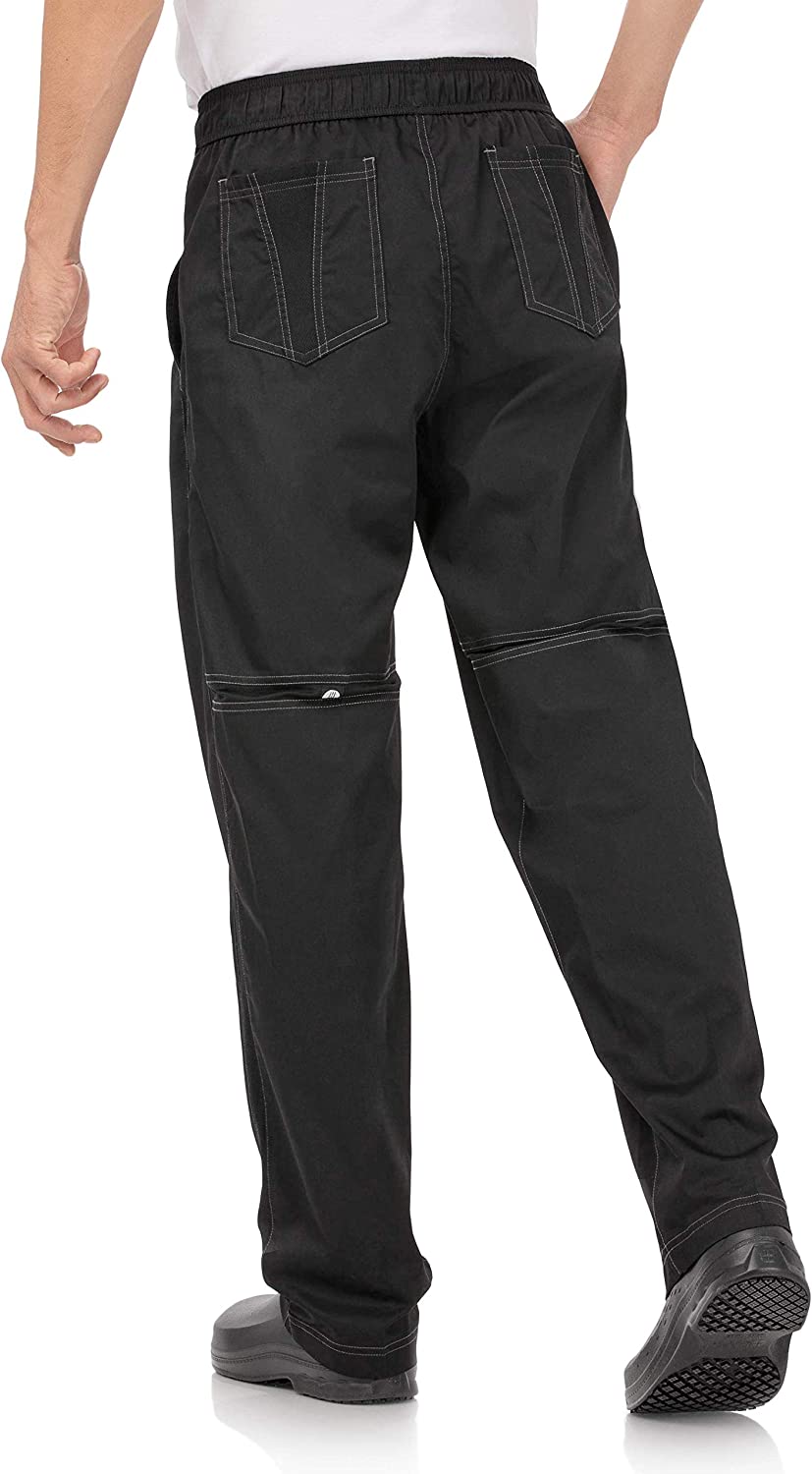 4.6 oz. 65/35 poly/cotton 'lite' twill fabric with Cool Vent inserts on side seam and back of knee, double-needle stitching, curved elastic waistband with drawstring, zipper fly, 2 slanted side pockets and 2 back pockets with CV detail.