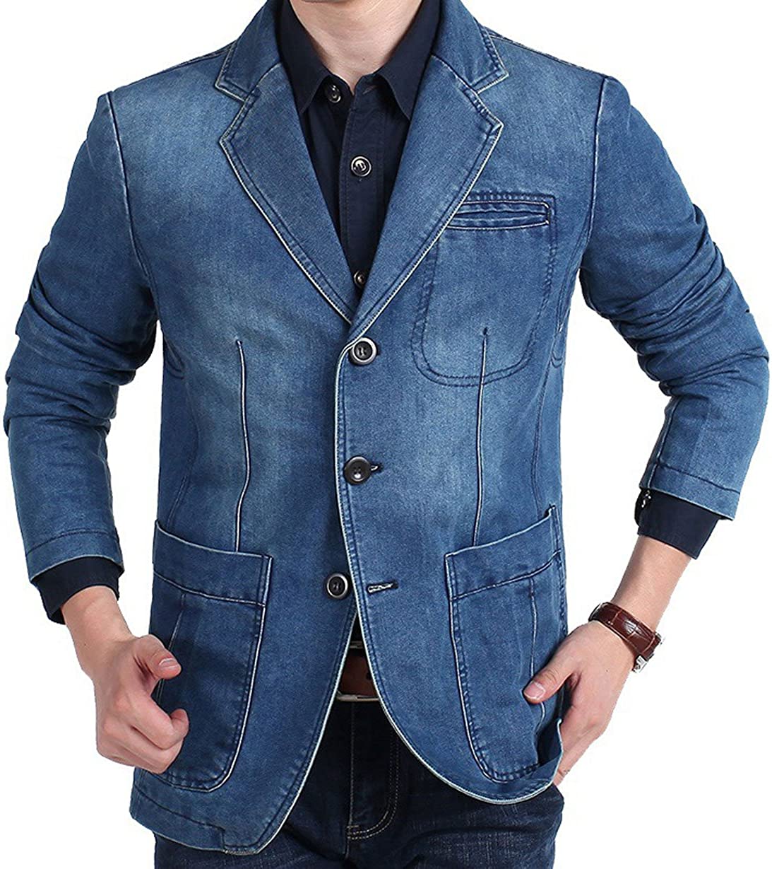 chouyatou Men's Classic Notched Collar 3 Button Tailoring Distressed Denim Blazer Jacket