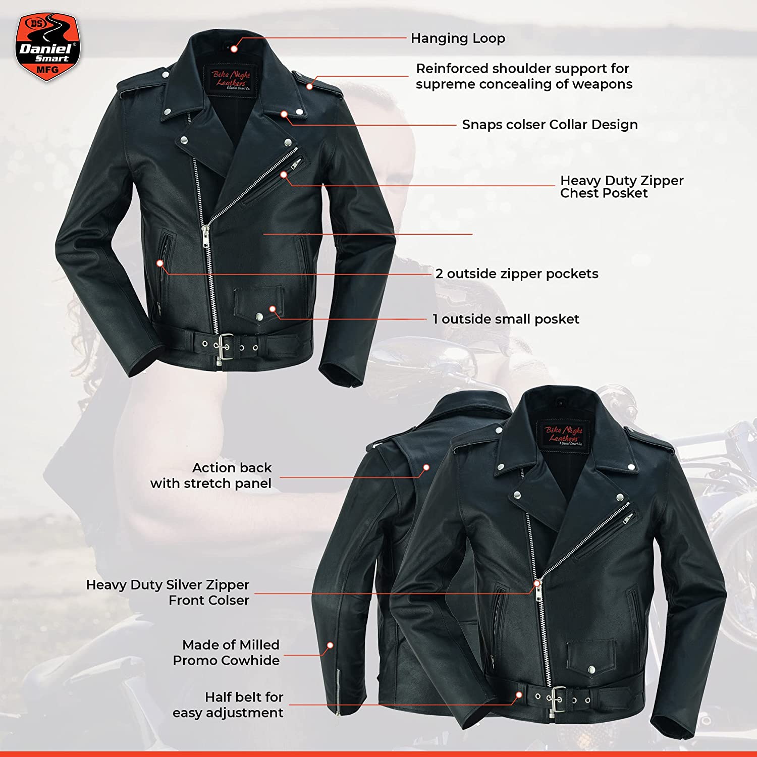 Daniel Smart Classic Men’s Leather Jacket - Economy Grade Cowhide Motorcycle Leather Jacket with Plain Sides & Armory Pockets