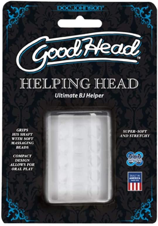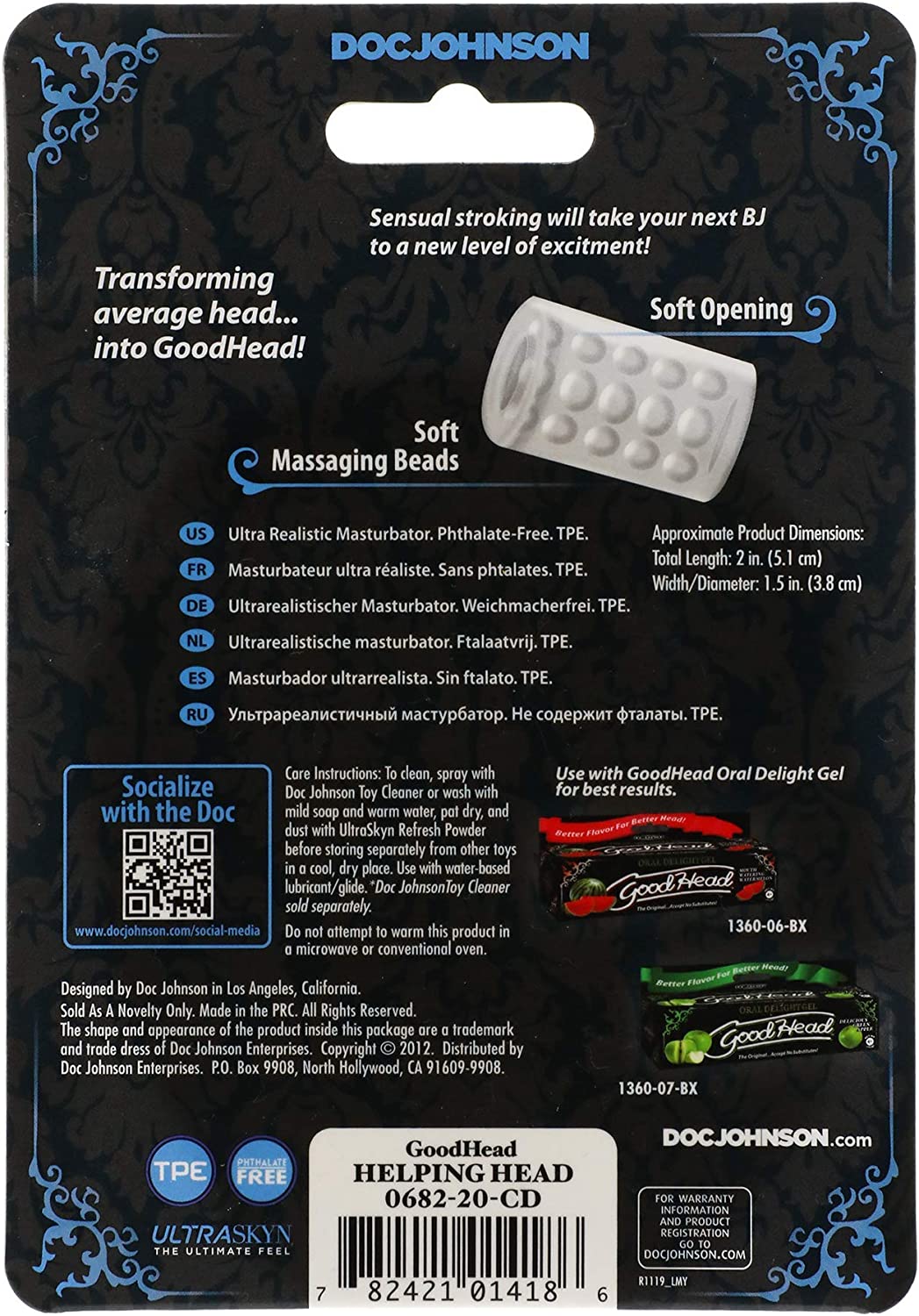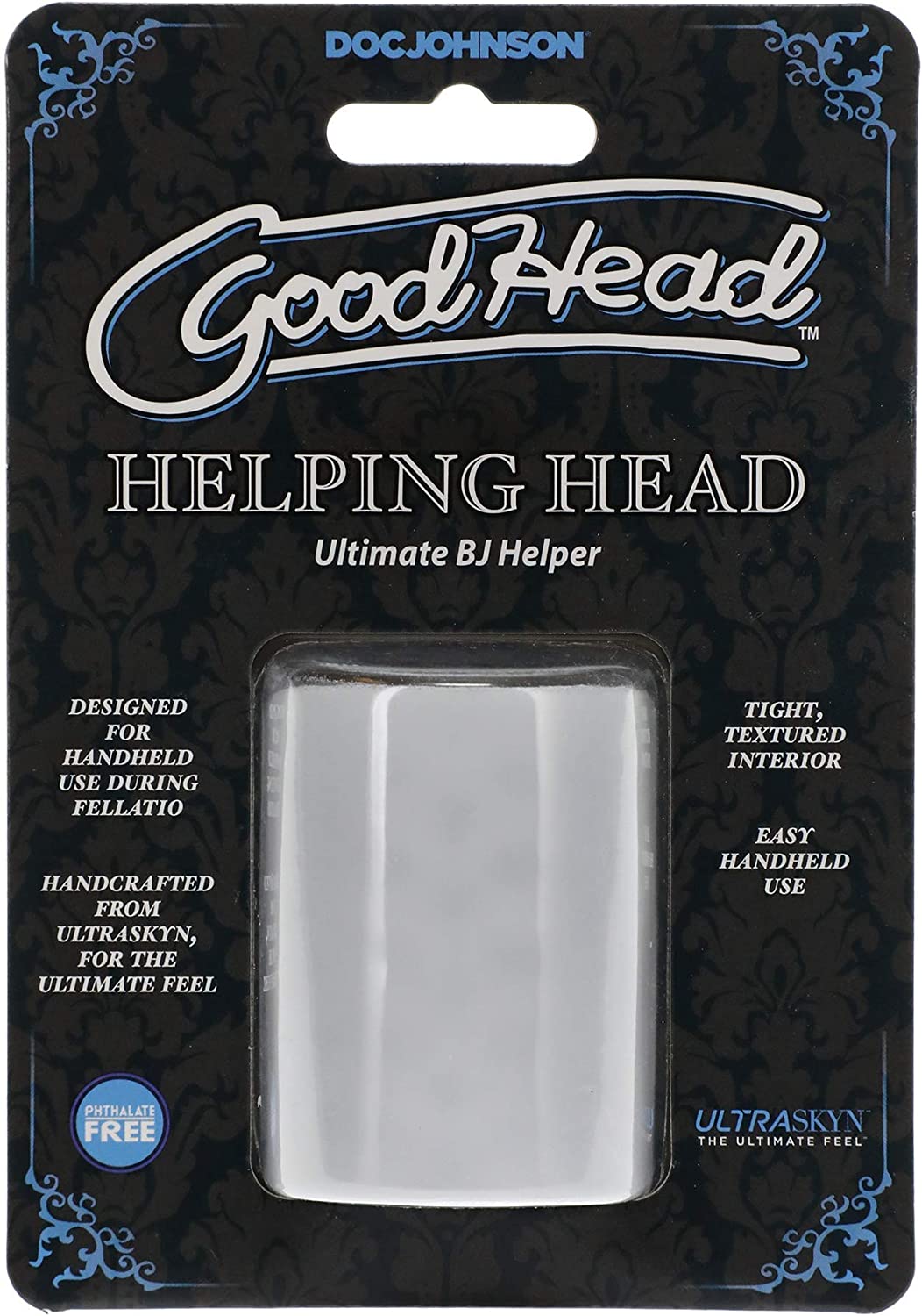 Doc Johnson's GoodHead Helping Head is a revolutionary 2” mini stroker specifically designed for handheld use to heighten the sensations and pleasure during a BJ. Having trouble getting your mouth around the last inch or two? The Helping Head Stroker was designed to help couples create the mind-blowing sensation of deep throat. By sliding the stroker up and down the shaft, the receiver can get the sensation of a mouth covering their entire manhood, while the giver can avoid the pain and potential embarrassment from gagging. While it’s original use was to enhance pleasure during a BJ the GoodHead Helping Head is also being utilized by Female-to-Male Transguys in some new and exciting ways. Some are using the Helping Head stroker as a donut for a narrow pumping chamber. Other transguys use this stroker after they have pumped and utilize it similarly to how other guys use a stroker. The sensation of penetration seems to be highly arousing and pleasurable. Stimulating massage beads on the inside, this stretchy stroker is made from our clear ultra-realistic ULTRASKYN material, for the most lifelike experience in the world. Turn GoodHead into great head tonight! Proudly made in America.
