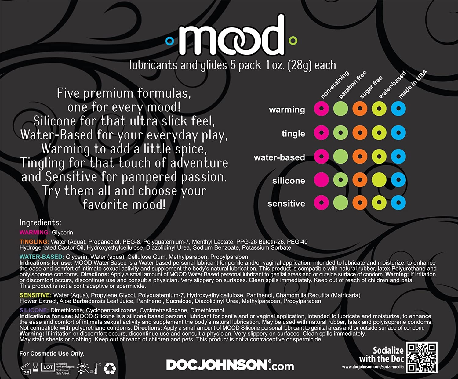 Doc Johnson Mood - Lube & Glide Sample Pack - Silicone Lube, Warming Glide, Tingling Glide, Water-Based Lube, Sensitive Glide - 5 x 1 fl.oz. (5 X 29.5 ml)