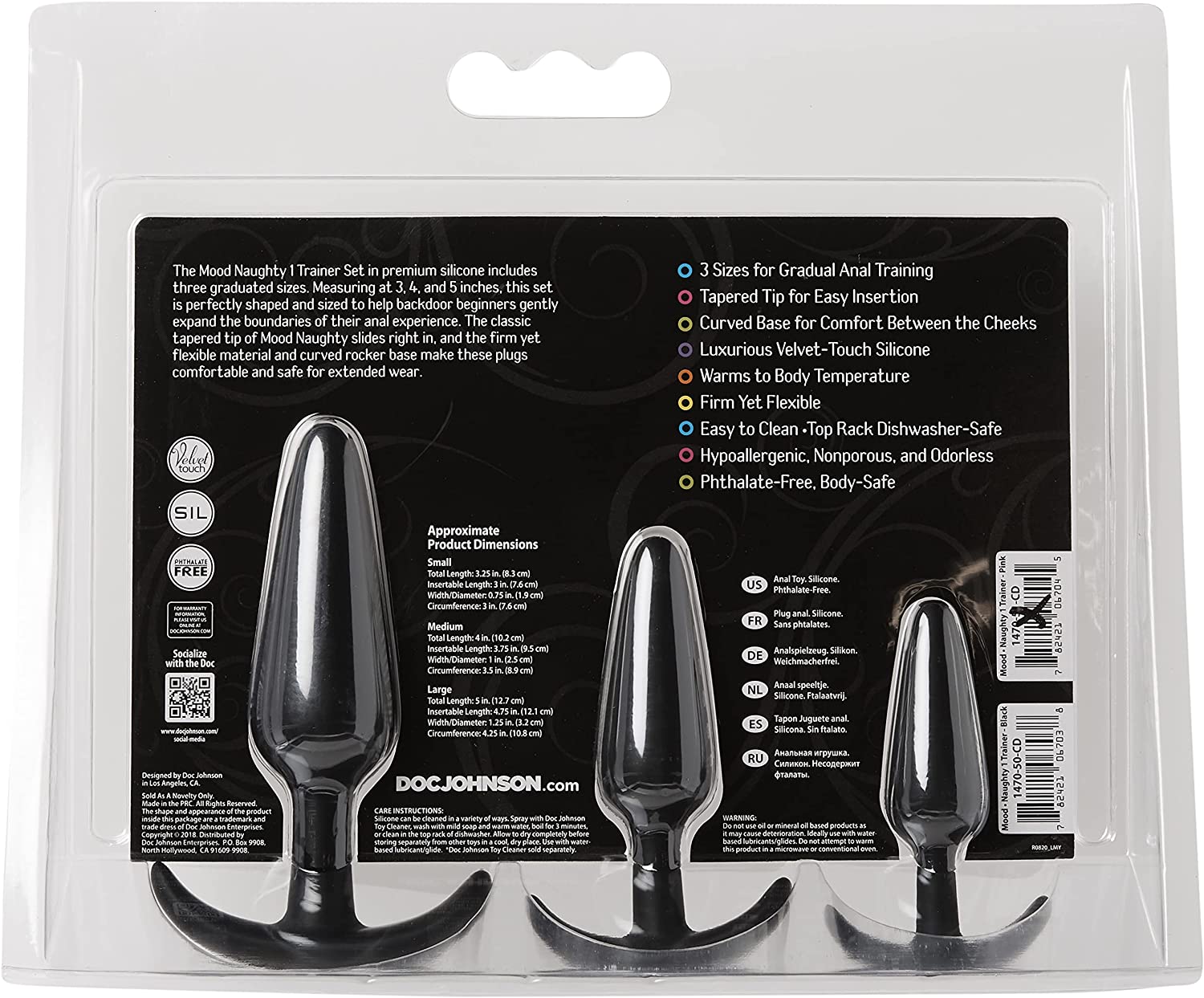 How naughty do you want it? The Mood Naughty 1 Trainer Set in premium silicone includes our bestselling original Mood Naughty butt plug in three graduated sizes. Measuring at 3, 4, and 5 inches, this set is perfectly shaped and sized to help backdoor beginners gently expand the boundaries of their anal experience. The classic tapered tip of Mood Naughty slides right in, and the firm yet flexible material and curved rocker base make these plugs comfortable and safe for extended wear.