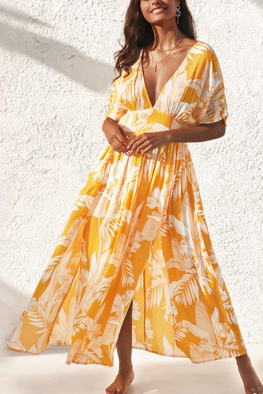 Dress for Women Summer Midi Dress V Neck Button Elastic Waist Cut Out Back 3/4 Sleeves Floral Printed