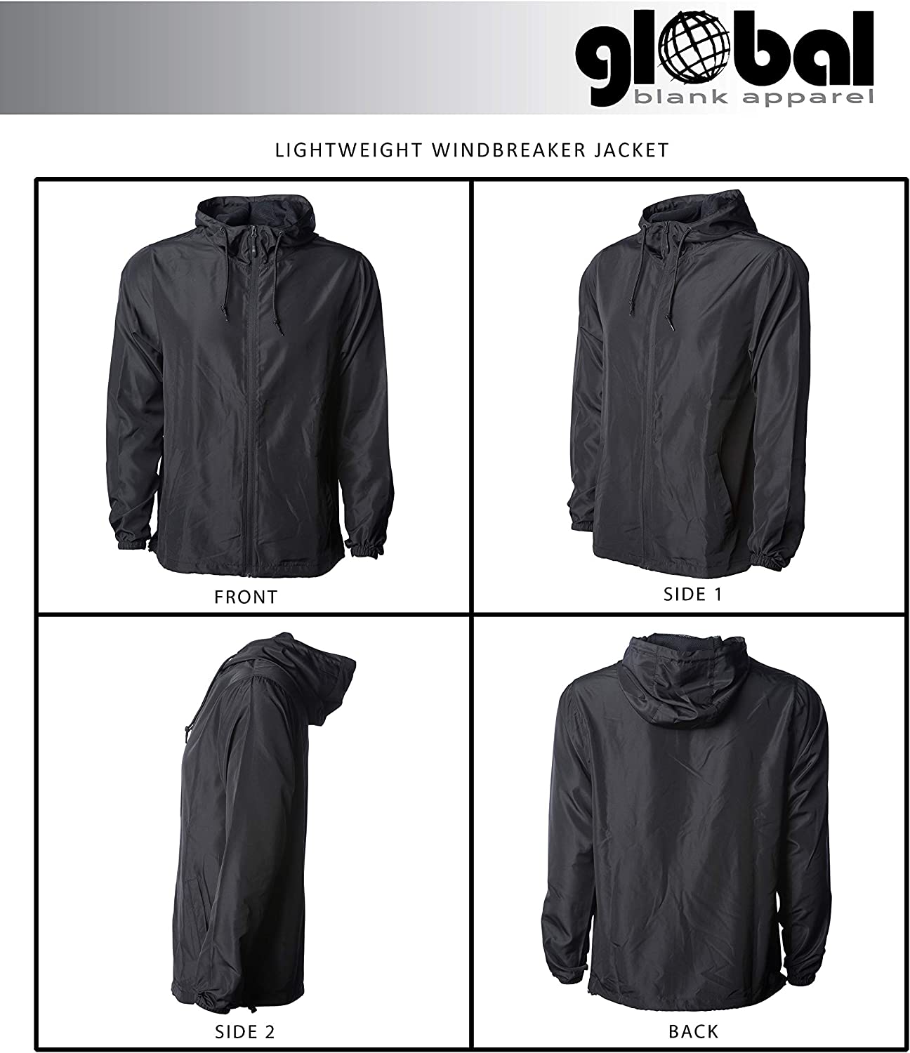 Global Blank Lightweight Winter Water-Resistant Windbreaker, Zip-Up Hoodie Jacket for Men and Women