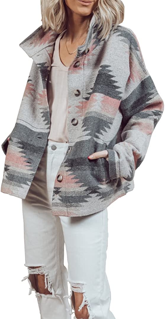 Heltapy Womens Aztec Shacket Jacket Loose Vintage Boho Wool Blend Coat Button Down Shirt Tops