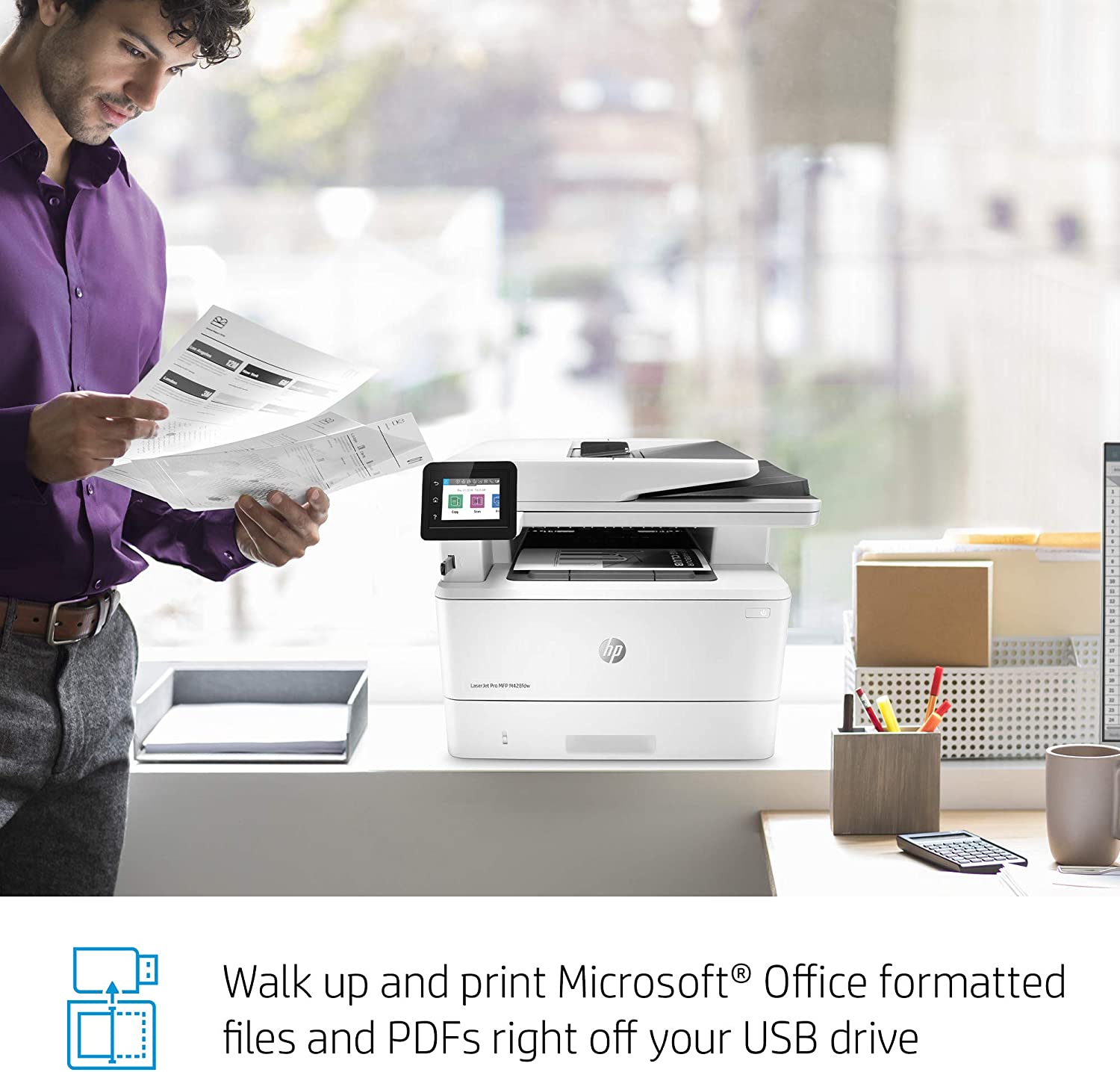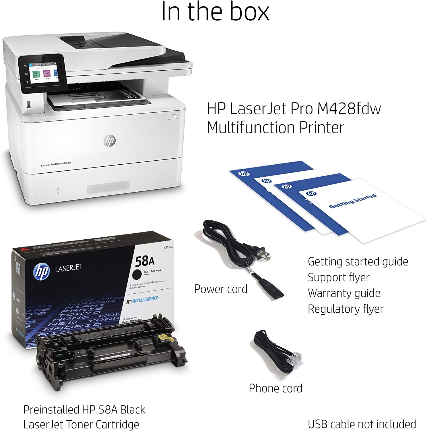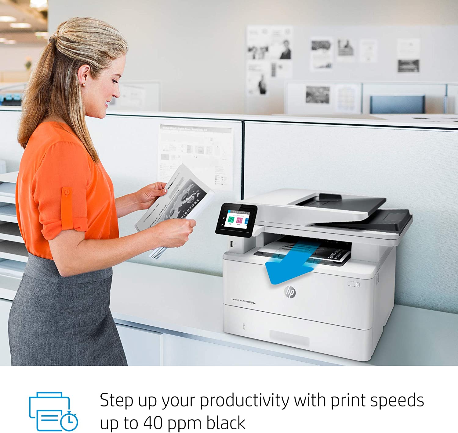 It's built to keep your business moving forward, the HP LaserJet Pro Multifunction Printer M428fdw keeps up with how you actually work, collaborate, and get things done. With fast print, scan, copy, and fax capabilities, best-in class security, and automated workflows, this multifunction monochrome laser printer is designed to let you focus your time on growing your business and staying ahead of the competition. Maximize productivity with an intuitive touchscreen control panel and automatic 2-sided printing, and stay connected with easy mobile printing options. This wireless laser printer is also designed with the environment in mind; save up to 22% over prior products with HP Eco Smart black toner, and help save paper right out of the box with the default paper savings mode.