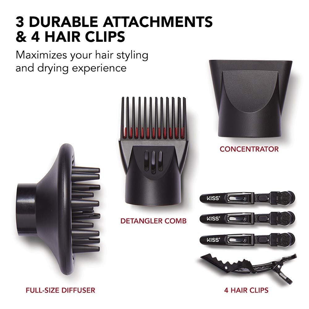 Experience a powerful, yet lightweight drying sensation with the KISS 1875 Pro Tourmaline ceramic blow dryer. Fast and easy drying allows hair to stay soft and silky while the Tourmaline ceramic technology helps tidy The cuticle layer, creating smooth, shiny hair With frizz-free results. Plus, three super durable attachments are included to maximize your hair styling and drying experience. The high rotation 1875 Watt DC motor delivers maximum drying power with a cool-shot bottom to lock in your style. A removable filter is included to prevent lint build-up in order to maximize motor life.