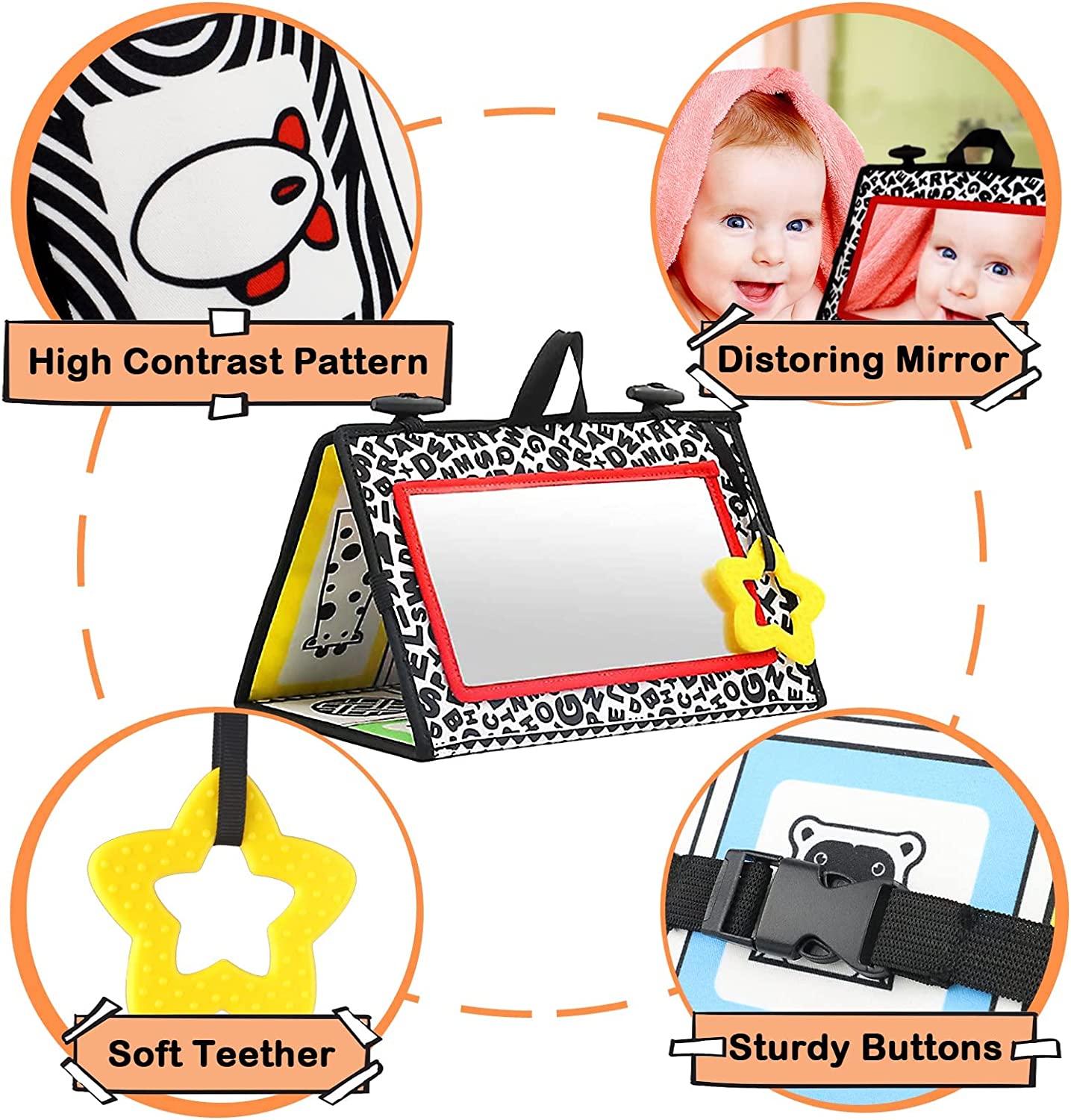 KUANGO Tummy Time Mirror Toys for Babies, High Contrast Activity Montessori Newborn Toys, Black and White Baby Toys 0 3 6 12 Sensory Infant Toys 0-3 Months