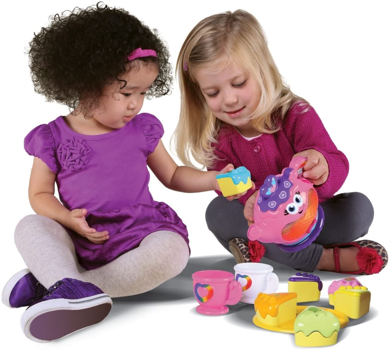 The LeapFrog Musical Rainbow Tea Party includes 10 play pieces, including 2 teacups, 6 colorful cake pieces, a cake plate and lighted, musical teapot. Parent Guide & Instruction Book included.