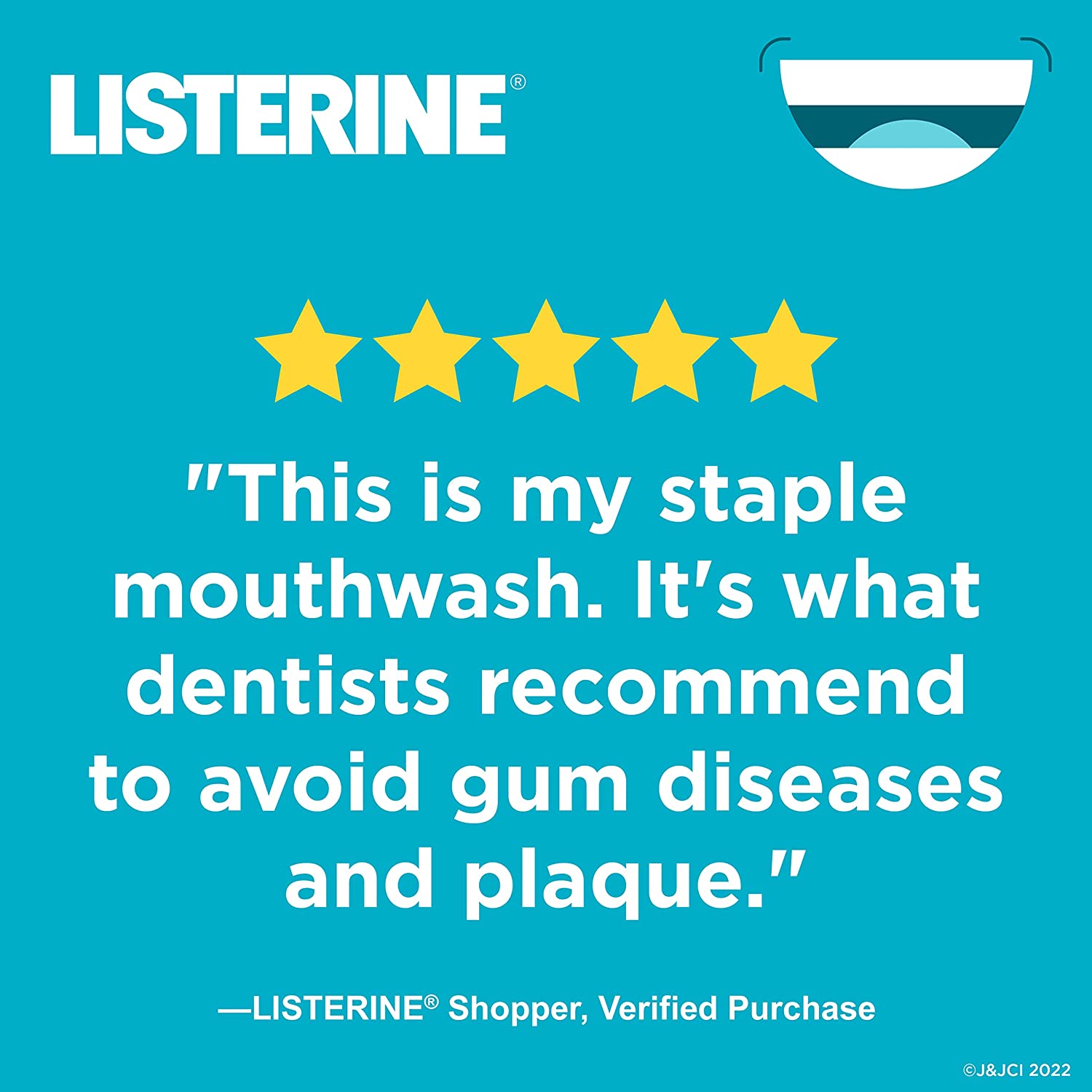 Protect your mouth from germs and get fresh breath with Listerine Cool Mint Antiseptic Mouthwash. It kills 99.9% of germs that cause bad breath, plaque and gingivitis, for a fresher and cleaner mouth than brushing alone. Accepted by the American Dental Association, this germ-killing mouthwash for bad breath is clinically shown to reduce plaque 52% more and reduce gingivitis 21% more than brushing and flossing alone. Adding a 30-second rinse to your morning and evening routines is all it takes to get 24-hour germ protection and achieve maximum results. Listerine Cool Mint Antiseptic Mouthwash leaves your mouth feeling intensely clean.