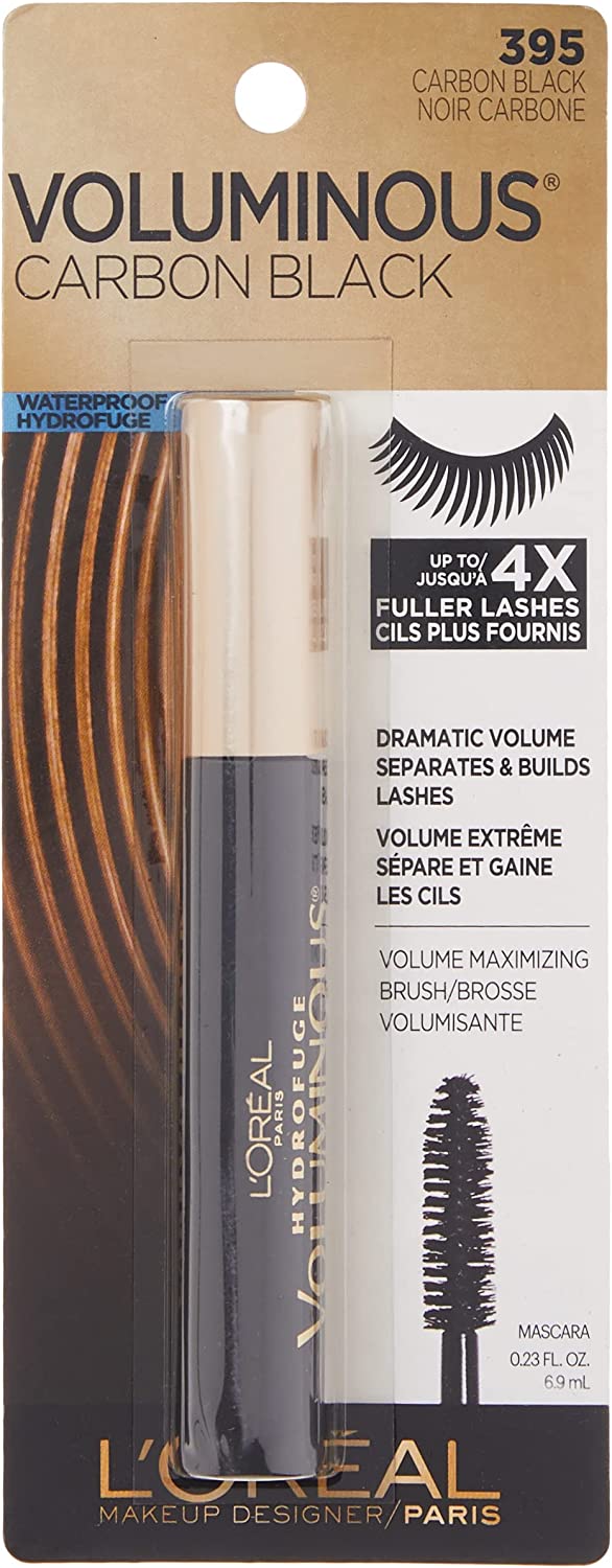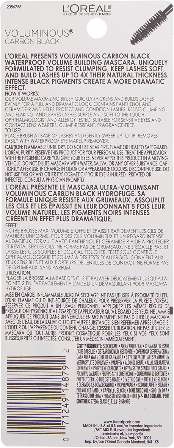 L’Oral Paris Voluminous Waterproof Carbon Black Volume Building Mascara is uniquely formulated to resist clumping, keep lashes soft, and build lashes up to 4x their natural thickness. Intense black pigments create a more dramatic effect that lasts all day. Volume Maximizing Brush quickly thickens and builds lashes evenly for a full and dramatic look. Contains Panthenol and Ceramide-R and helps protect and condition lashes. Resists clumping and flaking, and leaves lashes supple and soft to the touch. Packaging may vary. What you receive may not be what is reflected on site. • Bold, volume building mascara • Up to 4x fuller lashes • Intense black pigments • Clump-resistant, Waterproof mascara Place brush at base of lashes and gently sweep up to tip. Removes easily with waterproof eye makeup remover. Flammable until dry. Do not use near fire, flame or heat. To safeguard L’Oral purity, reserve this product for your personal use. Treat the applicator with the hygienic care you give your eyes. Never apply this product in a moving vehicle. Do not dilute mascara with water, saliva, or any other substance. Cap tightly after use. If change in odor or appearance occurs, discontinue use. Do not use this or any other eye cosmetic if your eye is injured, irritated or infected. Consult a physician.
