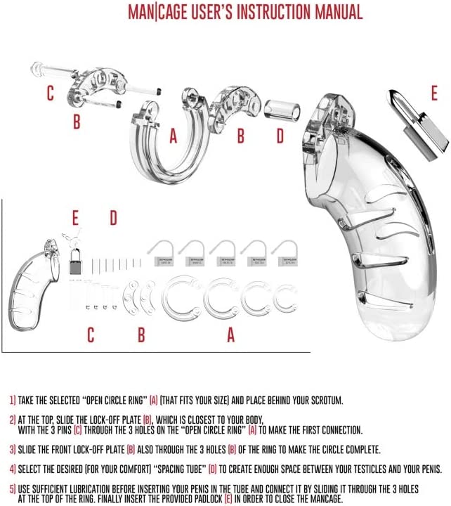 TAKE YOUR BDSM-PLAY TO THE NEXT LEVEL. CONTROL OR BE CONTROLLED, THAT'S THE QUESTION.The Man|Cage Chastity Cages are manufactured from high-grade polycarbonate, a very light, durable and hypoallergenic material. The cage consists of three parts which fit perfectly together. The two guidance pins connect the top parts and the oval taper pin connects the rings with the cage. A variety of rings in different sizes and distance pieces will allow you to create the perfect size. The rings have a comfortable fit and are absolutely safe. A metal lock or tie-wrap lock can easily close the cage. The included tie-wrap locks ensure that they will not trigger the alarm of metal detectors at parties, festivals or even airports. As hygiene is very important while wearing a cage, the superior Man|Cage series are equipped with a variety of vents and a urination opening. The cage makes it impossible to get an erection but it will be, after liberation, super intense, just like the freeing orgasm to follow. The Man|Cage Chastity Cage gives the key-holder optimal power over sexual gratification.