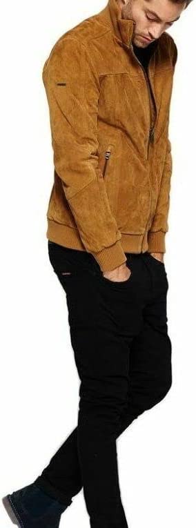 Men's CLassic Stylish Slim Fit Brown Bomber Trucker Biker Genuine Suede Leather Motorcycle Jacket