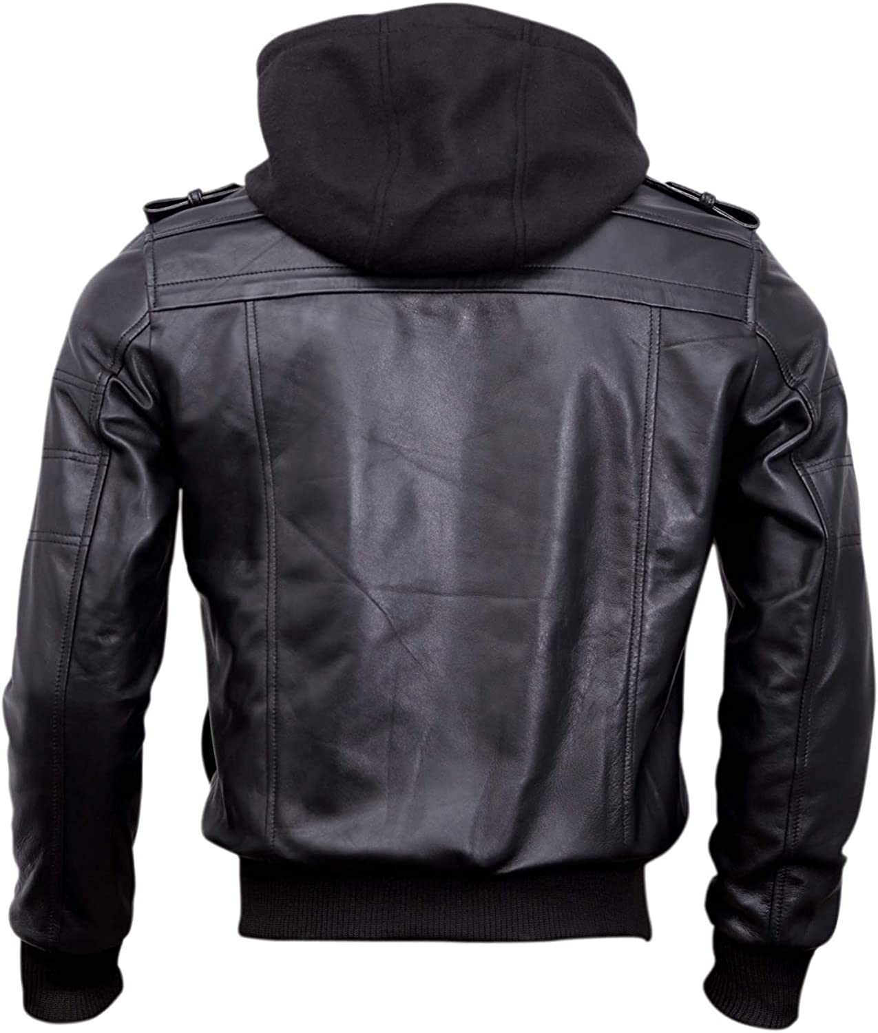 Mens Genuine Black Hooded Bomber Leather Jacket | Real Lambskin Waxed Brown Leather Jackets for Men with Removable Hood