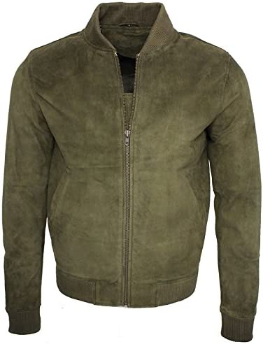 Mens Retro Khaki Goat Suede Leather Bomber Varsity Jacket