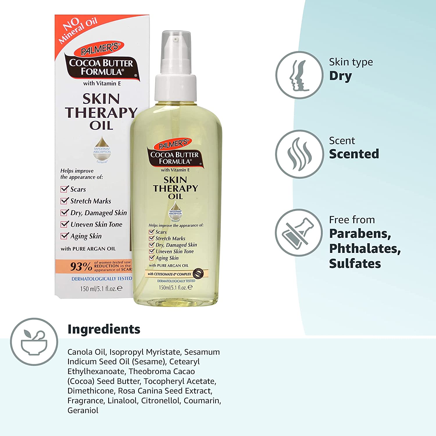 You’ve heard of using creams and lotions to help your skin stay hydrated or heal dry, damaged skin, but have you considered moisturizing body oils? Some of the best body oils for glowing skin have naturally-derived ingredients, including cocoa butter, coconut oil and argan oil. The Palmer's Skin Therapy Oil collection harnesses all of the cocoa butter benefits and blends it with other skin-loving ingredients to hydrate and pamper your skin. Cocoa butter is a natural emollient that works well for moisturizing skin and aiding with scar lightening, while Vitamin E is rich in antioxidants and helps to heal damaged skin. When blended together they help to minimize scars and keep skin hydrated and healthy-looking. Not only is Skin Therapy Oil one of the best oils for dry skin on the body, it also helps improve the appearance of imperfections. A staple in many women’s skin care routines, this advanced multi-purpose dry oil is rich in essential fatty acids, vitamins and antioxidants to perfect skin all-over-the body by improving the appearance of stretch marks, scars and dry, damaged or uneven skin. Try the Palmer's Skin Therapy Body Oil in the original or rosehip fragrance for hydrated, glowing and perfected skin.