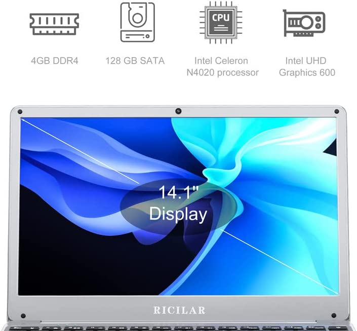 RICILAR Windows 10 Home Laptop, 14.1 Inch HD Display, Intel Celeron N4020, 4GB RAM, 128GB SSD, Backlit Keyboard, Type C, HDMI, Wi-Fi 5, Silver, School Laptop Computer for Students and Business