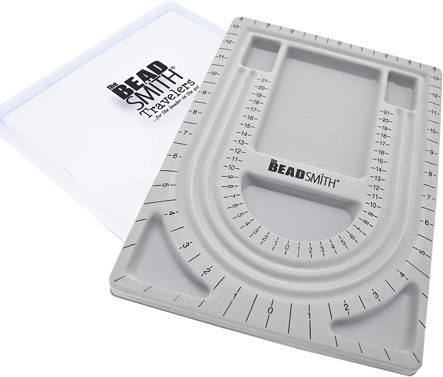 Lay out your designs before you string them! Try out as many bead combinations as you like and find your ideal creation without cutting a thread. Enable your creativity and prevent having to redo your necklaces over and over because you decide you don't like the results after you finish! This gray-flocked plastic bead design board has three channels for laying out beads, and six compartments in which to sort the beads and components you are working with. The channels are marked in both inches and centimeters. Clear Plastic lid snaps on so you can pack away your half-finished projects without having to undo anything. Measurements, including clear plastic cover are 13 1/4 inches long X 9 1/2 inches wide X 3/4 inch high.