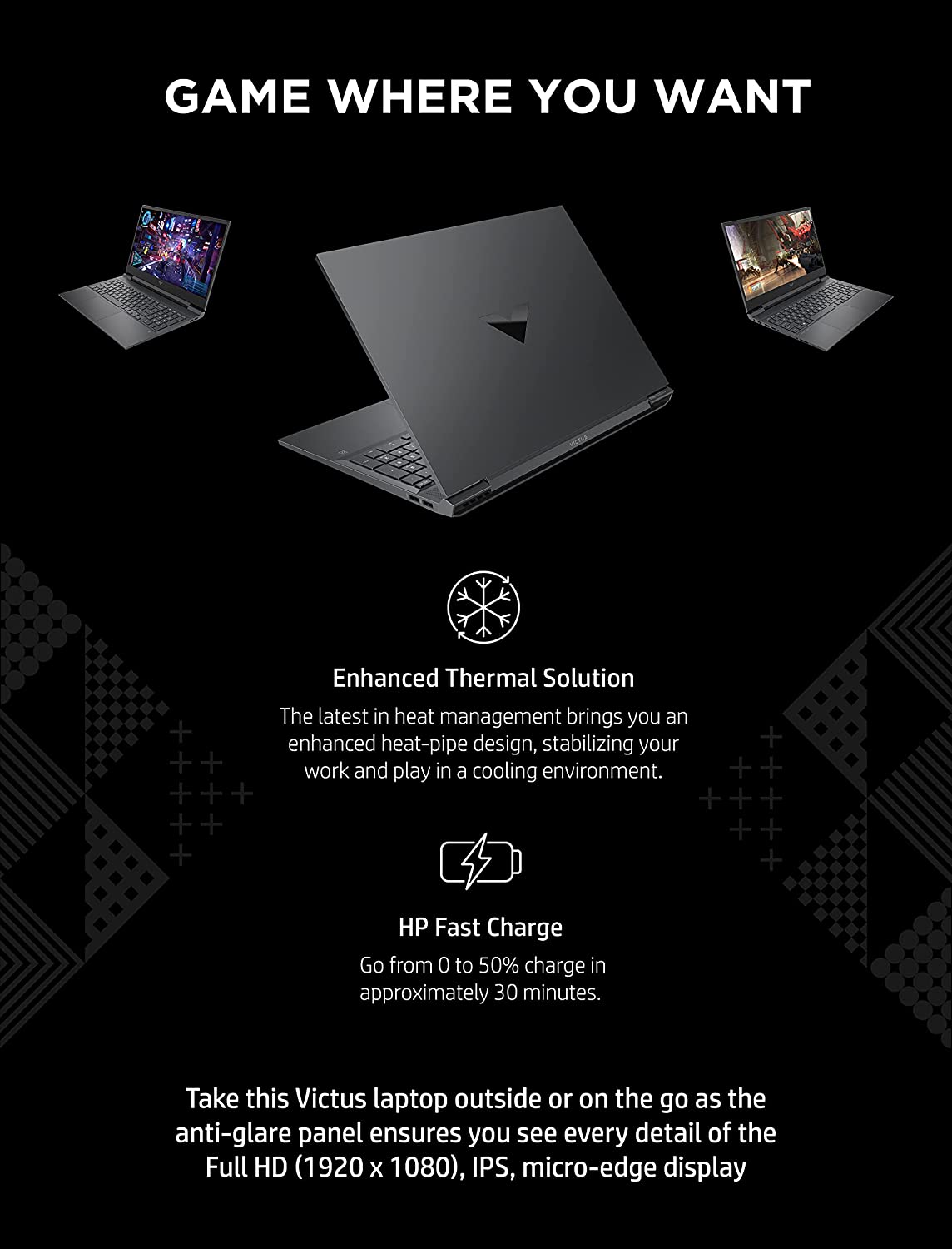 It’s playtime for gamers everywhere with the Victus by HP 16.1 inch Gaming Laptop PC. Play with power as award-winning hardware such as the NVIDIA® GeForce RTX™ 3050 architecture (with 4 GB of dedicated memory) dials the graphics up a notch (2). Game on the go, even outside in direct sunlight, thanks to the 1080p micro-edge display with an anti-glare panel (3). Enjoy elite levels of gaming performance with the AMD Ryzen™ 5 5600H Mobile Processor, boasting up to 4.2 GHz max boost clock (4) (5). Experience increased responsiveness and improved frame rates with 8 GB of RAM, as well as shorter load times and faster boot-ups as 512 GB SSD of storage is perfect for file heavy, modern gaming titles (6) (7). All of your laptop computer’s advanced hardware is cooled and stabilized with an enhanced thermal solution, upgraded specifically for this AMD gaming laptop (1). Game on as additional software and hardware features enable all-day play sessions. No need to put this laptop for gaming down with 10 hours and 30 minutes of battery life (8). What’s more, even if you do run out of power, HP Fast Charge gets you back in the game fast with 50% charge in just 30 minutes (9). Even on a futuristic device such as this, your Windows 10 laptop feels familiar with an operating system you understand and enjoy (10). Compute with confidence courtesy of a 1-year hardware warranty. Stay connected, even while out of the house with the powerful Wi-Fi 6 (2x2) and Bluetooth® 5.2 combo, offering ultra-fast gigabit data rate (11) (12). Elevate your play in the OMEN Gaming Hub. Everything gaming is now in your control, from earning play-based gaming rewards to fine tuning every performance and lighting nuance for a truly personalized gaming experience. Built with the environment in mind, your Windows laptop is designed using sustainable materials like ocean-bound plastic in the speaker enclosure and post-consumer recycled plastic in the keycaps (13) (14). The outer boxes and fiber cushions used in the packaging are 100% sustainably sourced and recyclable (15). Not only is your device eco-conscious but also energy efficient, being both ENERGY STAR® certified and EPEAT® Silver registered (16) (17). (1) Thermal solution varies by configuration. (2) ©2021 NVIDIA Corporation. NVIDIA, the NVIDIA logo, GeForce, and GeForce RTX have registered trademarks and/or trademarks of NVIDIA Corporation in the United States and other countries. All other trademarks and copyrights are the property of their respective owners. (3) Full High Definition (FHD) content is required to view FHD images. (4) Multi-core is designed to improve the performance of certain software products. Not all customers or software applications will necessarily benefit from the use of this technology. Performance and clock frequency will vary depending on application workload and your hardware and software configurations. AMD’s numbering is not a measurement of clock speed. AMD and Radeon are trademarks of Advanced Micro Devices, Inc. (5) Max Boost clock frequency performance varies depending on hardware, software, and overall system configuration. GHz refers to the internal clock speed of the processor. Other factors besides clock speed may impact system and application performance. (6) Actual formatted capacity is less. A portion of internal storage is reserved for preloaded content. (7) Based on HP internal testing using CrystalDiskMark benchmarking software. Performance is sequentially faster (read-only) compared to traditional 5,400 rpm HDD. (8) Windows 10 MobileMark 18 battery life will vary depending on various factors including product model, configuration, loaded applications, features, use, wireless functionality, and power management settings. The maximum capacity of the battery will naturally decrease with time and usage. See bapco.com/products/mobilemark-2018/ for additional details. (9) Recharges your battery up to 50% within 30 minutes when the system is off (using the “shut down” command). Recommended for use with the HP adapter provided with the notebook, not recommended with a smaller capacity battery charger. After charging has reached 50% capacity, the charging speed will return to normal speed. Charging time may vary +/-10% due to System tolerance. (10) Not all features are available in all editions or versions of Windows. Systems may require upgraded and/or separately purchased hardware, drivers, software, or BIOS update to take full advantage of Windows functionality. Windows 10 is automatically updated, which is always enabled. ISP fees may apply and additional requirements may apply over time for updates. See microsoft.com (11) Wireless access point and internet service required and sold separately. The availability of public wireless access points is limited. Wi-Fi CERTIFIED 6TM (802.11ax) is backwards compatible with prior 802.11 specs. Wi-Fi CERTIFIED 6TM is designed to support gigabit data rate when transferring files between two devices connected to the same router. Requires a wireless router, sold separately, that supports 80MHz and higher channels. Only available in countries where 802.11ax is supported. (12) Bluetooth® is a trademark owned by its proprietor and used by Hewlett-Packard Company under license. (13) Percentage of ocean-bound plastic contained in each component varies by product. (14) Keyboard keycaps contain post-consumer recycled plastic. The percentage contained in each component varies by product. (15) 100% outer box/corrugate cushion packaging made from sustainably sourced certified and recycled fibers. Fiber cushions are made from 100% recycled wood fiber and organic material. Excludes plastic bags and plastic foam sheeting. (16) ENERGY STAR and the ENERGY STAR mark are registered trademarks owned by the U.S. Environmental Protection Agency. (17) Based on U.S. EPEAT® registration according to IEEE 1680.1-2018 EPEAT®. EPEAT® status varies by country. Visit www.epeat.net for more informatio