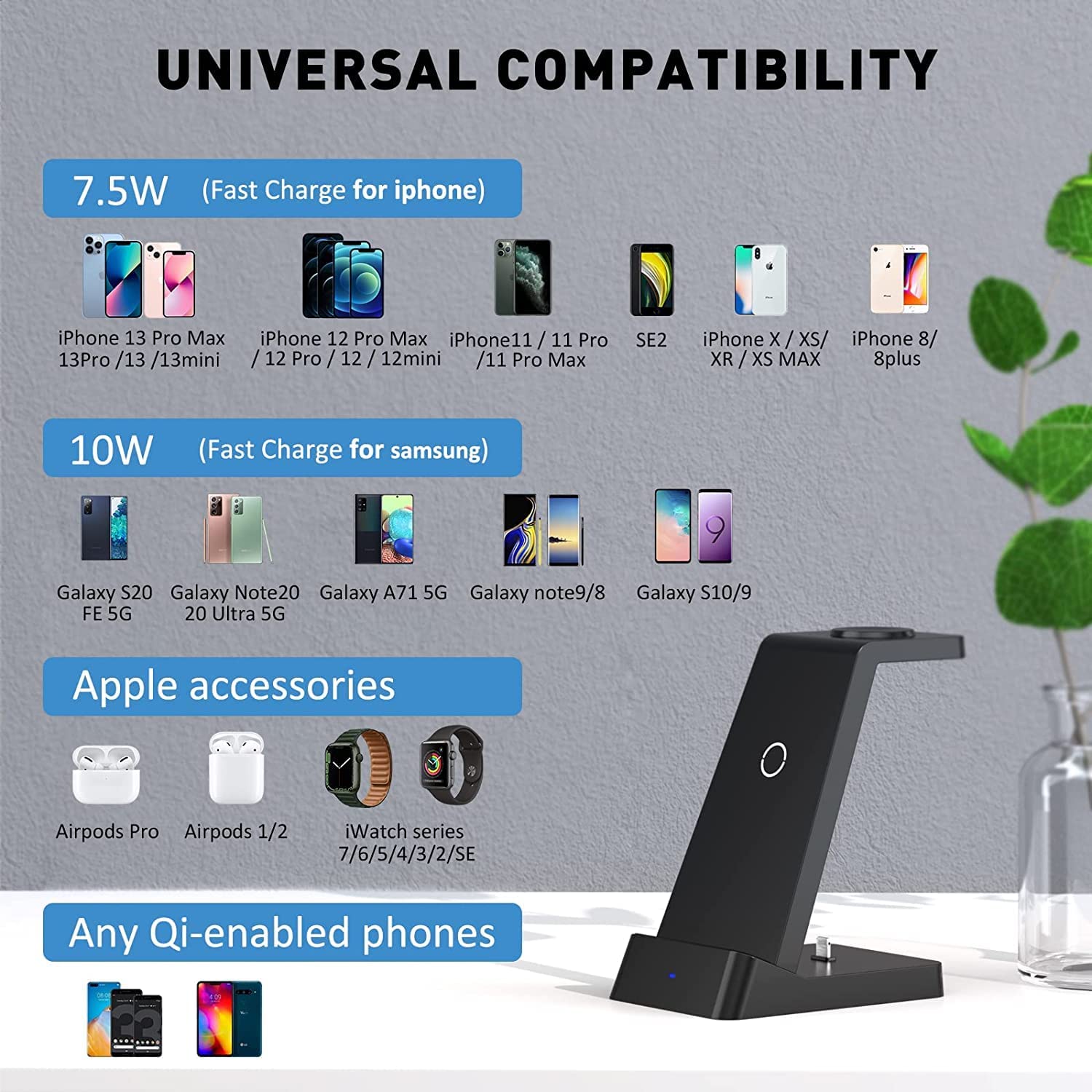 Wireless Charging Station, 18W Fast Wireless Charger Compatible with iPhone 13/12/11/Pro/SE/XS/XR/X/8 Plus/8, 3 in 1 Wireless Charging Dock Stand for Apple Watch Series & Airpods (with Adapter)