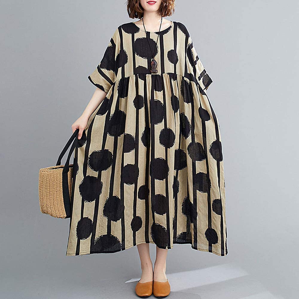 Women Cotton Linen Dress Casual Loose Bohemian Floral Maxi Dress with Pockets