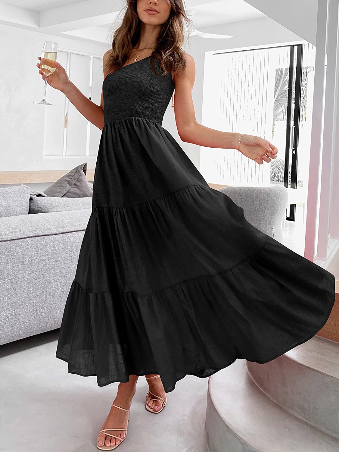 Women's Boho Summer Printed One Shoulder Sleeveless Smocked Flowy Tiered Beach Party Maxi Dress