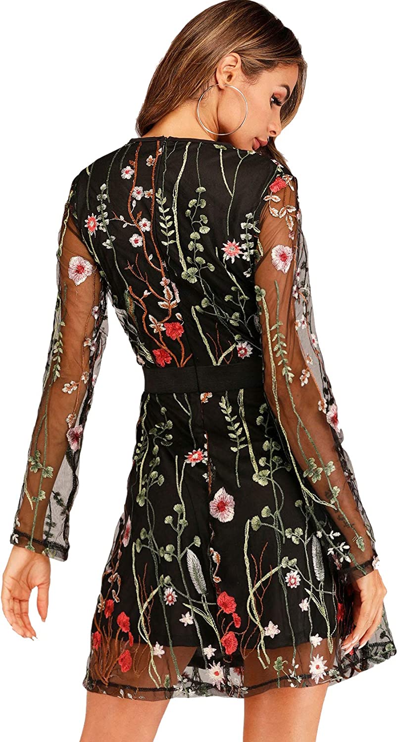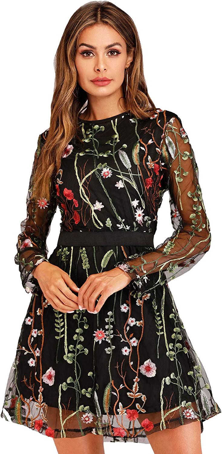 Women's Floral Embroidery Mesh Round Neck Tunic Party Dress
