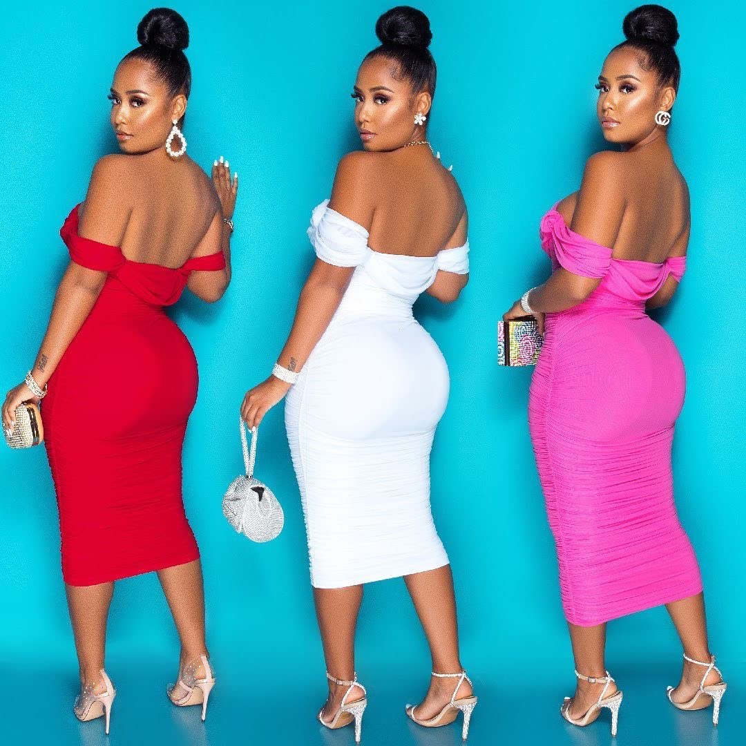 Women's Ruched Off Shoulder Short Sleeve Bodycon Midi Elegant Cocktail Party Dress