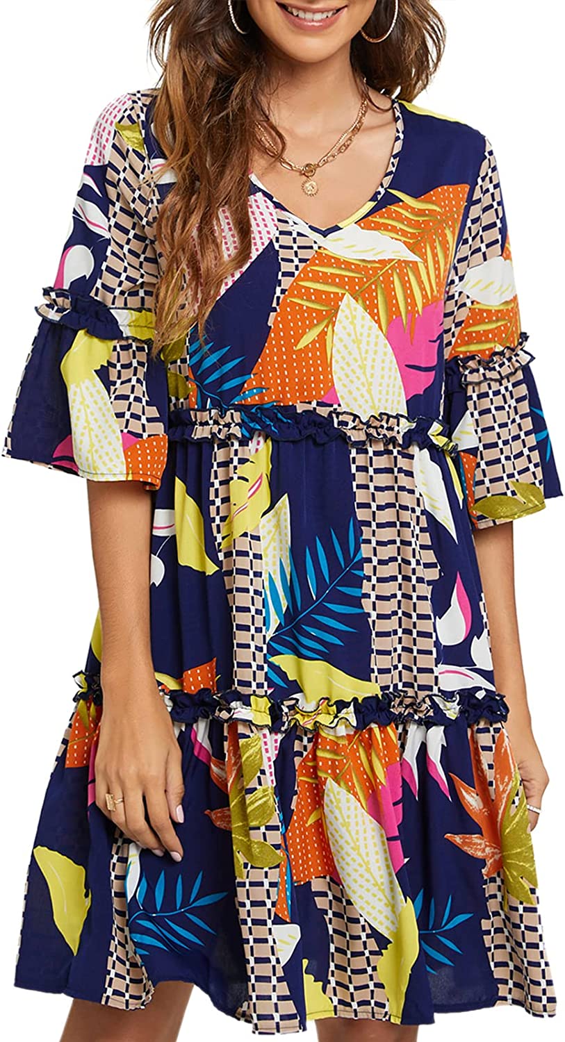 Women's Summer Dresses Flowy Tunic Mini Dress Short Sleeve V Neck Swing Dress