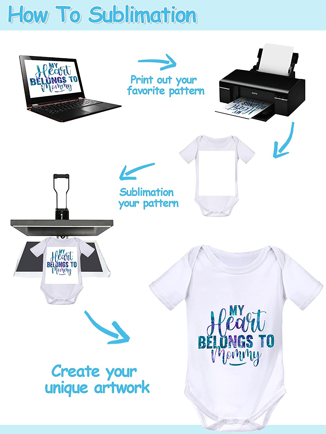 The blanks of baby bodysuit shirts allow you to sublimate or paint colorful patterns, words, logos, etc. It's a nice gift for your baby or friend who has a baby.