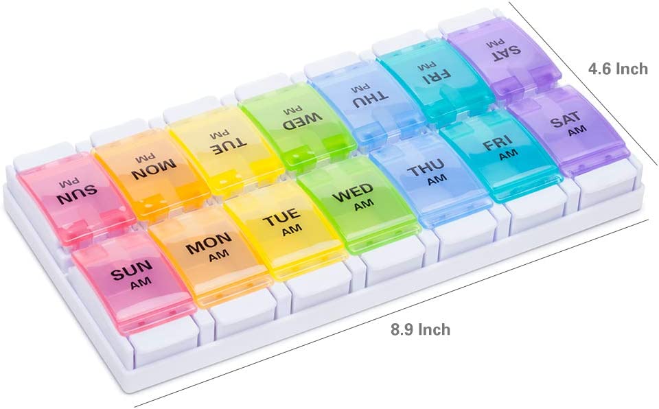 AM PM Weekly 7 Day Pill Organizer, Sukuos Large Daily Pill Cases Pill Box with Easy Push Button Design for Pills/Vitamin/Fish Oil/Supplements (Rainbow)