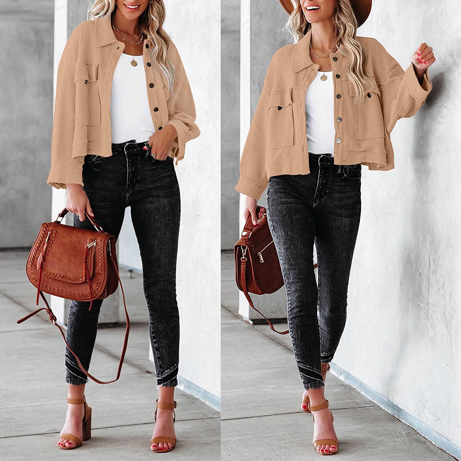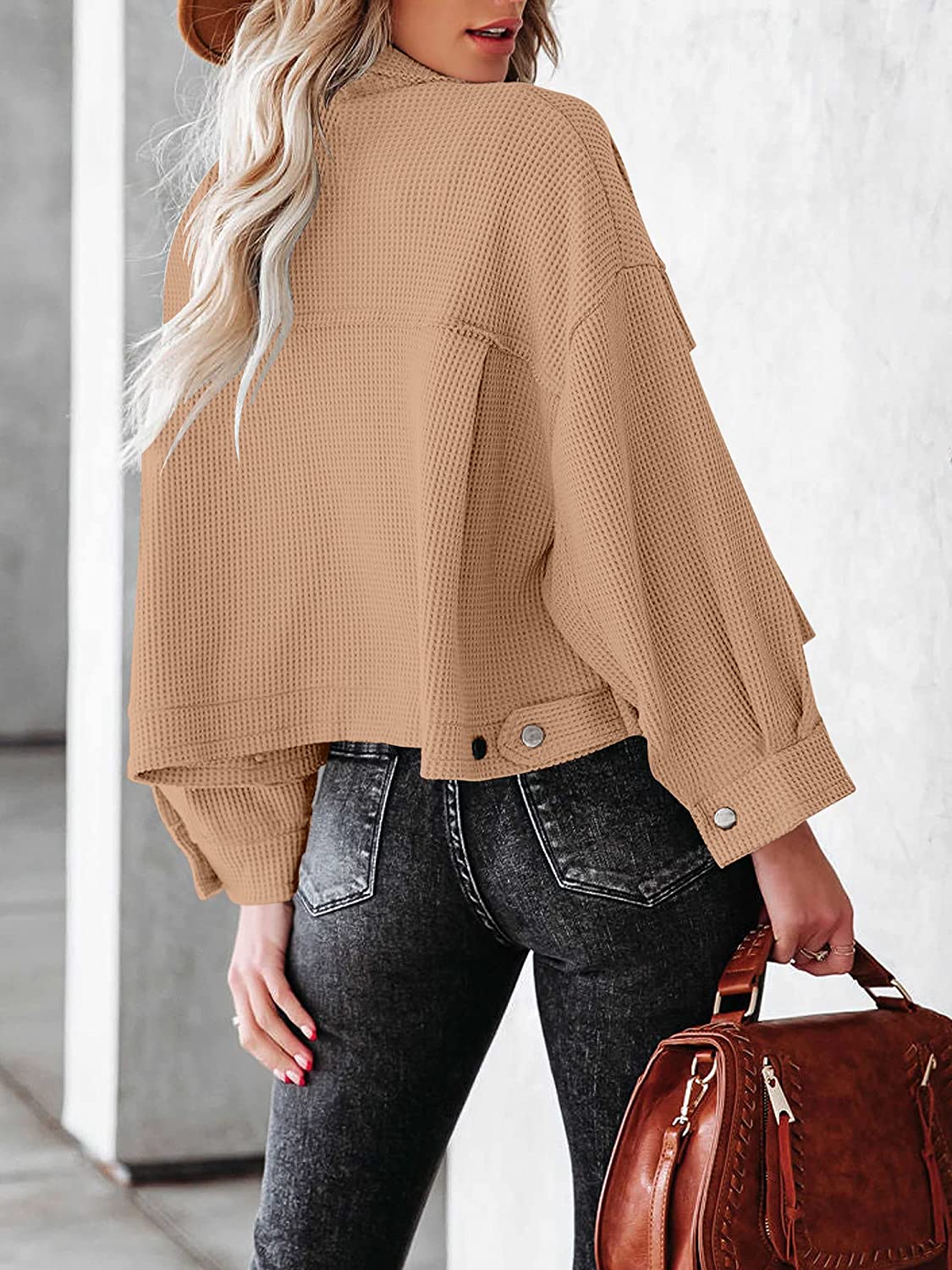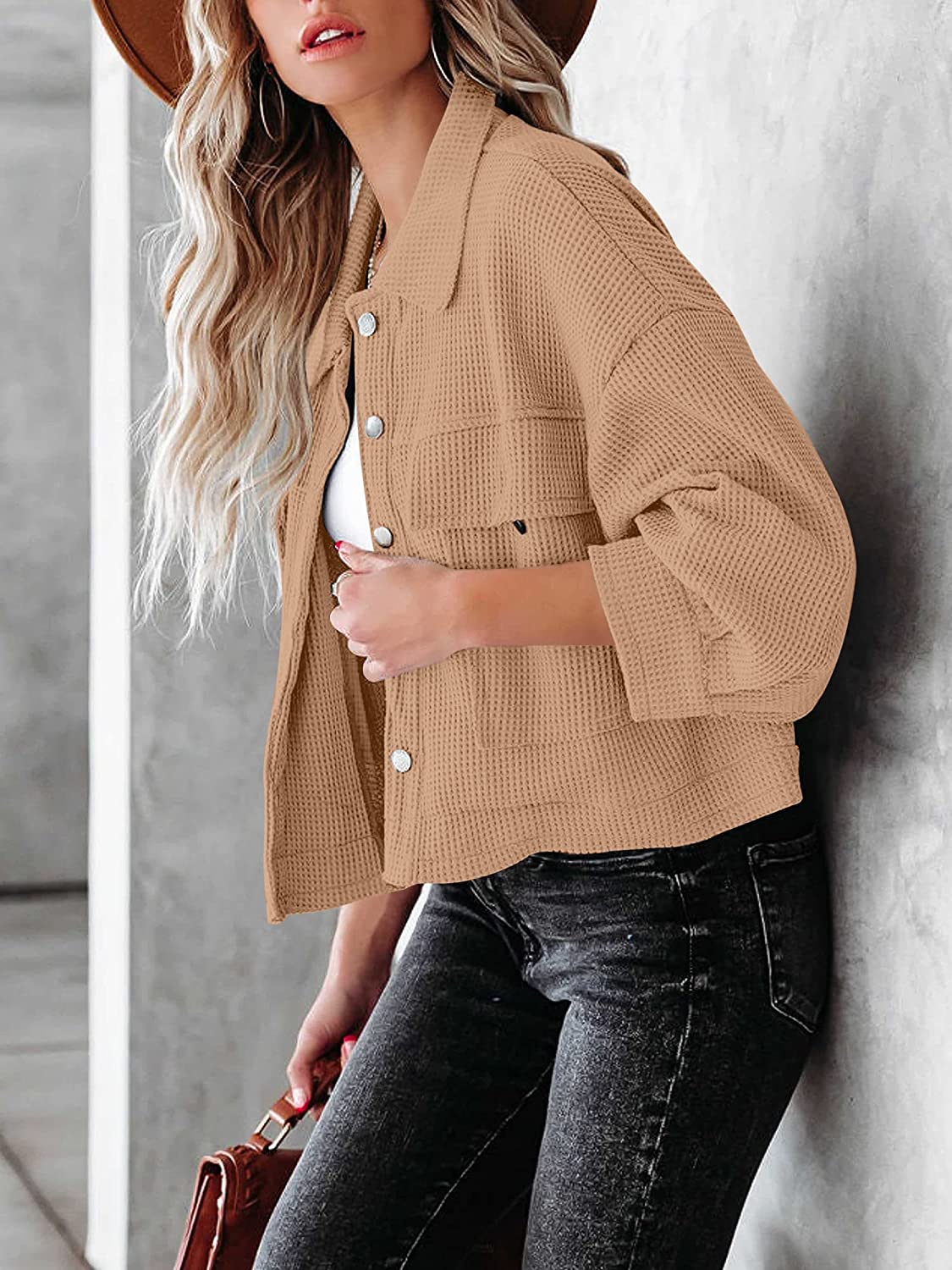 ANRABESS Women Waffle Knit Cropped Shacket Shirt Long Sleeve Collared Button Down Pockets Thermal Jacket Coat