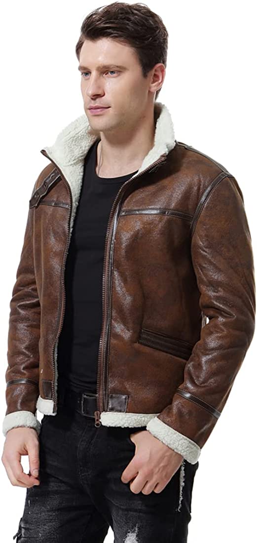 AOWOFS Men's Faux Leather Jacket Brown Motorcycle Bomber Shearling Suede Stand Collar