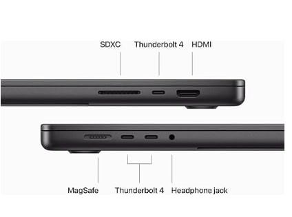 CONNECT IT ALL — This MacBook Pro features a MagSafe charging port, three Thunderbolt 4 ports, an SDXC card slot, an HDMI port, and a headphone jack. Enjoy fast wireless connectivity with Wi-Fi 6E and Bluetooth 5.3. And you can connect up to two external displays with M3 Pro, or up to four with M3 Max. (Wi‑Fi 6E available in countries and regions where supported.)