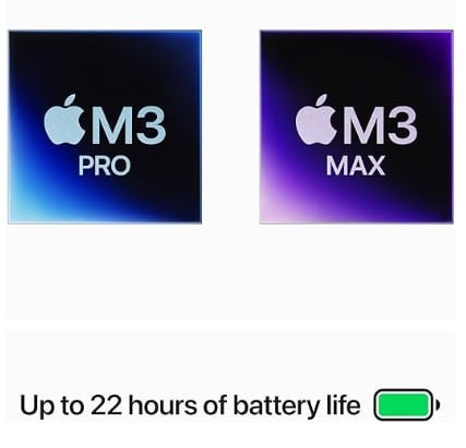 SUPERCHARGED BY M3 PRO OR M3 MAX — The Apple M3 Pro chip, with a 12-core CPU and 18-core GPU, delivers amazing performance for demanding workflows like manipulating gigapixel panoramas or compiling millions of lines of code. M3 Max, with an up to 16-core CPU and up to 40-core GPU, drives extreme performance for the most advanced workflows like rendering intricate 3D content or developing transformer models with billions of parameters.