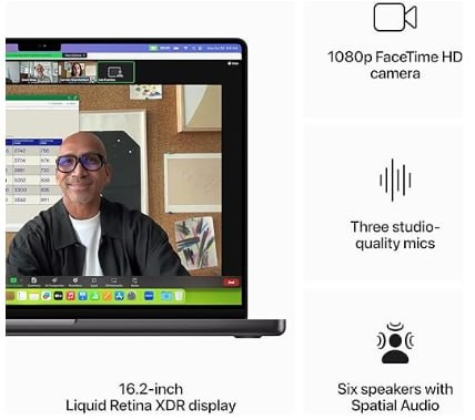 BRILLIANT PRO DISPLAY — The 16.2-inch Liquid Retina XDR display features Extreme Dynamic Range, over 1000 nits of brightness for stunning HDR content, up to 600 nits of brightness for SDR content, and pro reference modes for doing your best work on the go. (The display has rounded corners at the top. When measured diagonally, the screen is 16.2 inches. Actual viewable area is less.)