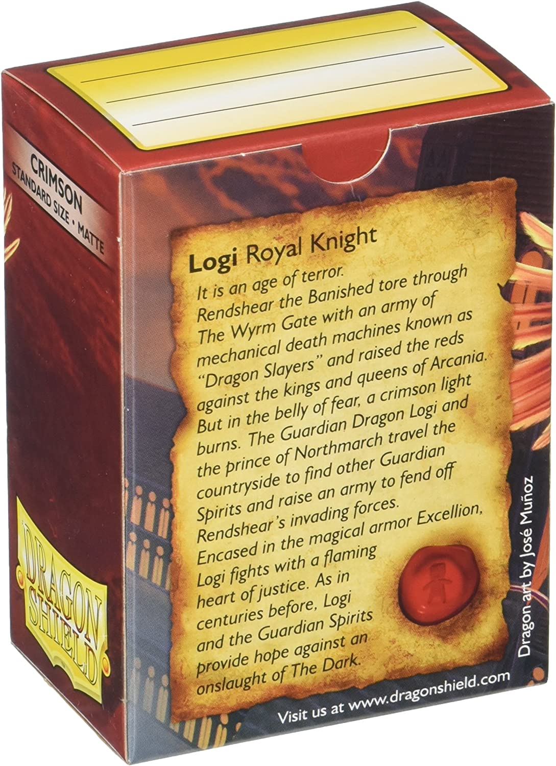 "Clear front & Matte Crimson back. The royal flames of duty and honor. Matte sleeves are our popular line of textured Dragon Shield with superior handling. A perfect mix of durability and shuffle-ability. The professor's #1 pick for card sleeves. The sturdy cardboard box fits 75+ single sleeved cards or 65+ double sleeved cards. Every box has a label at the top of the box for personalization. PVC-free polypropylene sleeves, no acid. Archival safe. Matte 120 μm quality thickness. For cards measuring up to 63x88 mm's (2½""x3½"")."