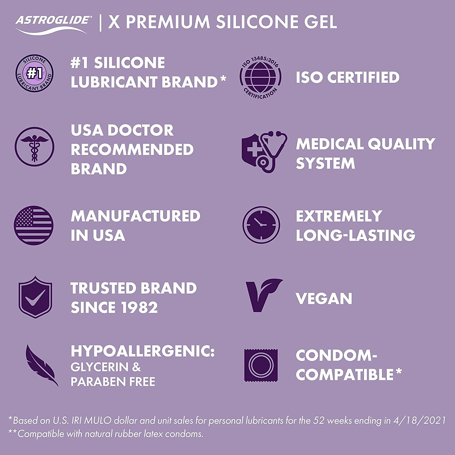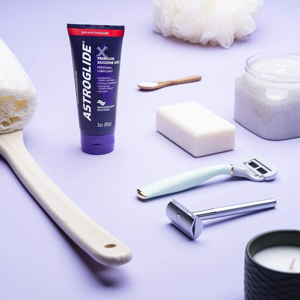This unique blend of high-quality silicone-based lubrication offers silky smooth satisfaction for sex play in and out of the water. Our lubricant is extremely long-lasting with a silky feel that is never sticky. The natural ability of silicone to resist water lets our lubricant stay slick and work great in settings where other types of lube wash away. Our hypoallergenic formula is a great choice for people with skin sensitivities. Made with coconut oil, ASTROGLIDE’s silicone lubricant gel stands out against other types of lube, both silicone-based and beyond. This lubricant is silky smooth, super long-lasting and works great for sensitive skin – from the shower to the bedroom. Let ASTROGLIDE bring you luxuriously long-lasting lubrication with this no-drip silicone gel.
