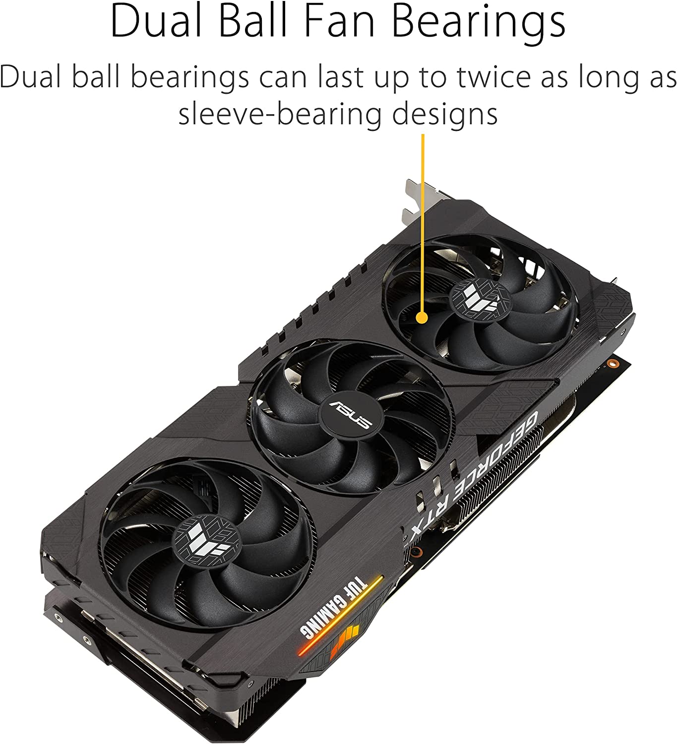 The TUF Gaming GeForce RTX 3070 Ti OC Edition 8GB GDDR6X features three Axial-tech Fans and a MaxContact heatsink to deliver best-in-class thermal performance. Military-grade Capacitors and other TUF components enhance durability and performance.