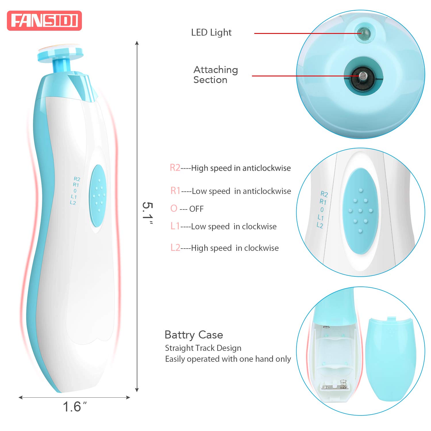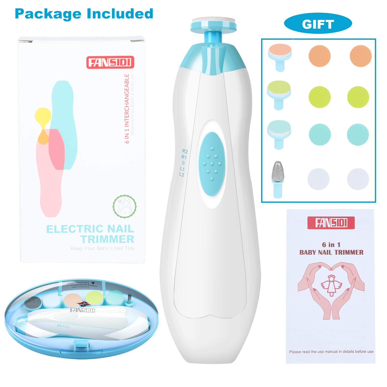 Baby Nail Clippers, FANSIDI Safe Baby Nail Trimmer Baby Nail File Electric with 10 Filing Pads 8 Sandpapers for Newborn Infant Toddler or Adult Toes Fingernails Care - AA Battery Operated (White/Blue)