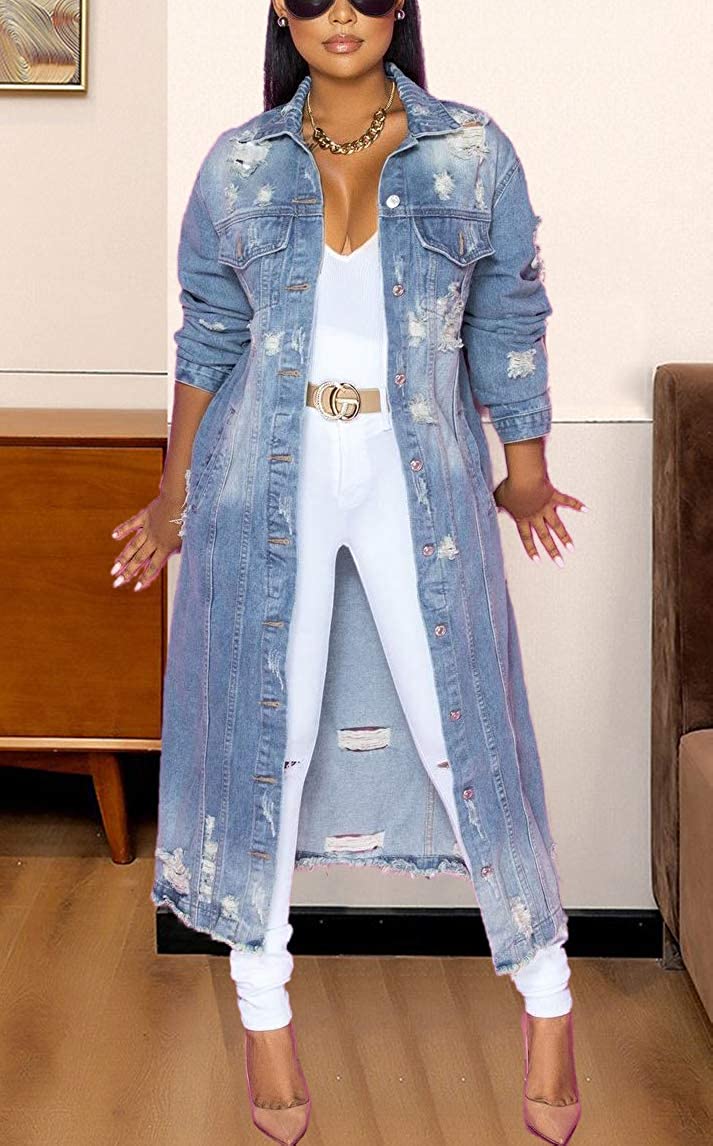 chouyatou Women's Spring Fashion Ripped Holes Maxi Long Denim Jacket Trench Coat