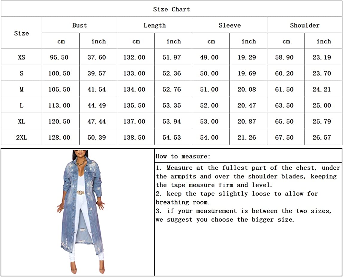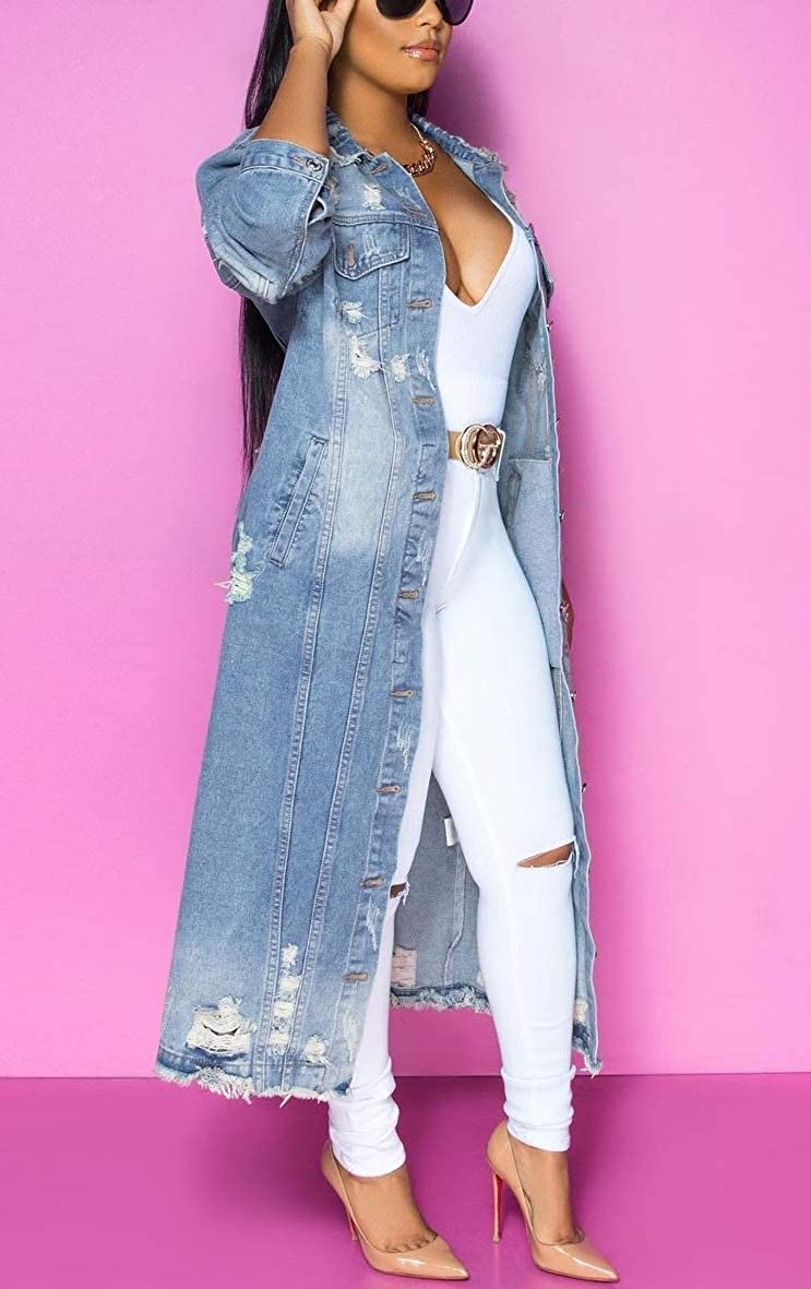 chouyatou Women's Spring Fashion Ripped Holes Maxi Long Denim Jacket Trench Coat