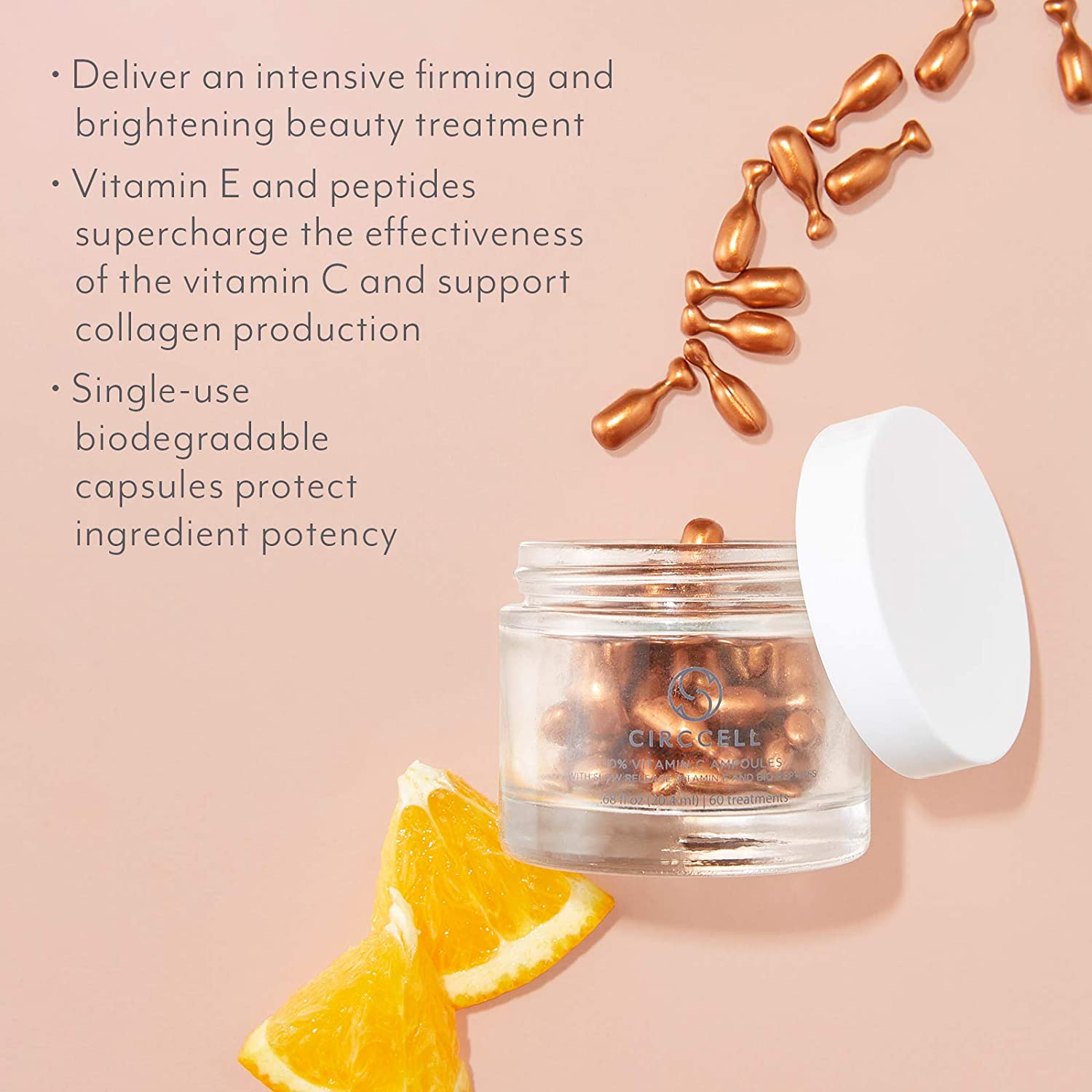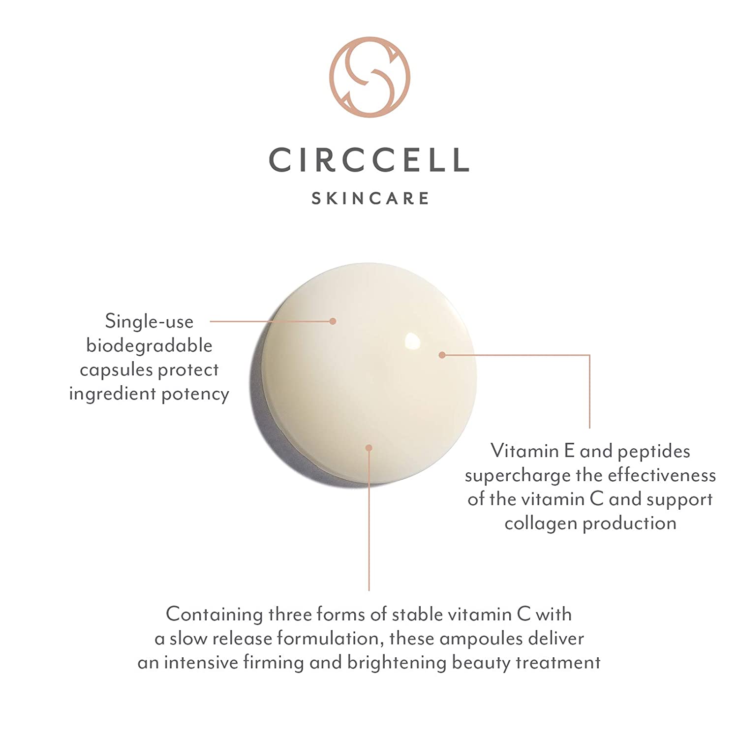 A breakthrough in clean biotechnology optimizes this antioxidant-packed anti-aging treatment with a cutting edge vitamin C delivery system. Sustainable, stable and superior, our encapsulated vitamin C blend offers immediate and sustained protection with its time-controlled release of actives, along with noticeable brightening and firming skin benefits – all delivered in a biodegradable ampoule.Containing three forms of stable vitamin C at 10% concentration to even skin tone, firm skin and provide environmental protection, the ampoules also contain vitamin E to accelerate the performance of other nutrients, and bio-peptides to supercharge the collagen-producing abilities of vitamin C.Suitable for dry, normal and oily skin, this vitamin C treatment is formulated in a pH neutral suspension making is safe for sensitive skin too. Designed for daily use, twist off the top of one vitamin C ampoule and empty the entire contents. Apply to the face, neck, décolleté and hands after cleansing, toning and prior to applying ABO Face Serum. The pearlescent texture doubles as a primer under makeup.Circcell Skincare Smartly-sourced, environmentally savvy, and delivering an experience that is oh-so-luxurious, Circcell is dedicated to transformation. Our products harness potent, age-defying ingredients and clean, natural actives known to deliver results through performance driven formulations, and the resulting collection works to keep skin beautiful from deep within. Clean, vegan and cruelty free, our skincare formulations are fragrance, paraben, and phthalate free, contain no harsh surfactants or artificial colors, and are supplied in BPA free, FSC certified packaging.
