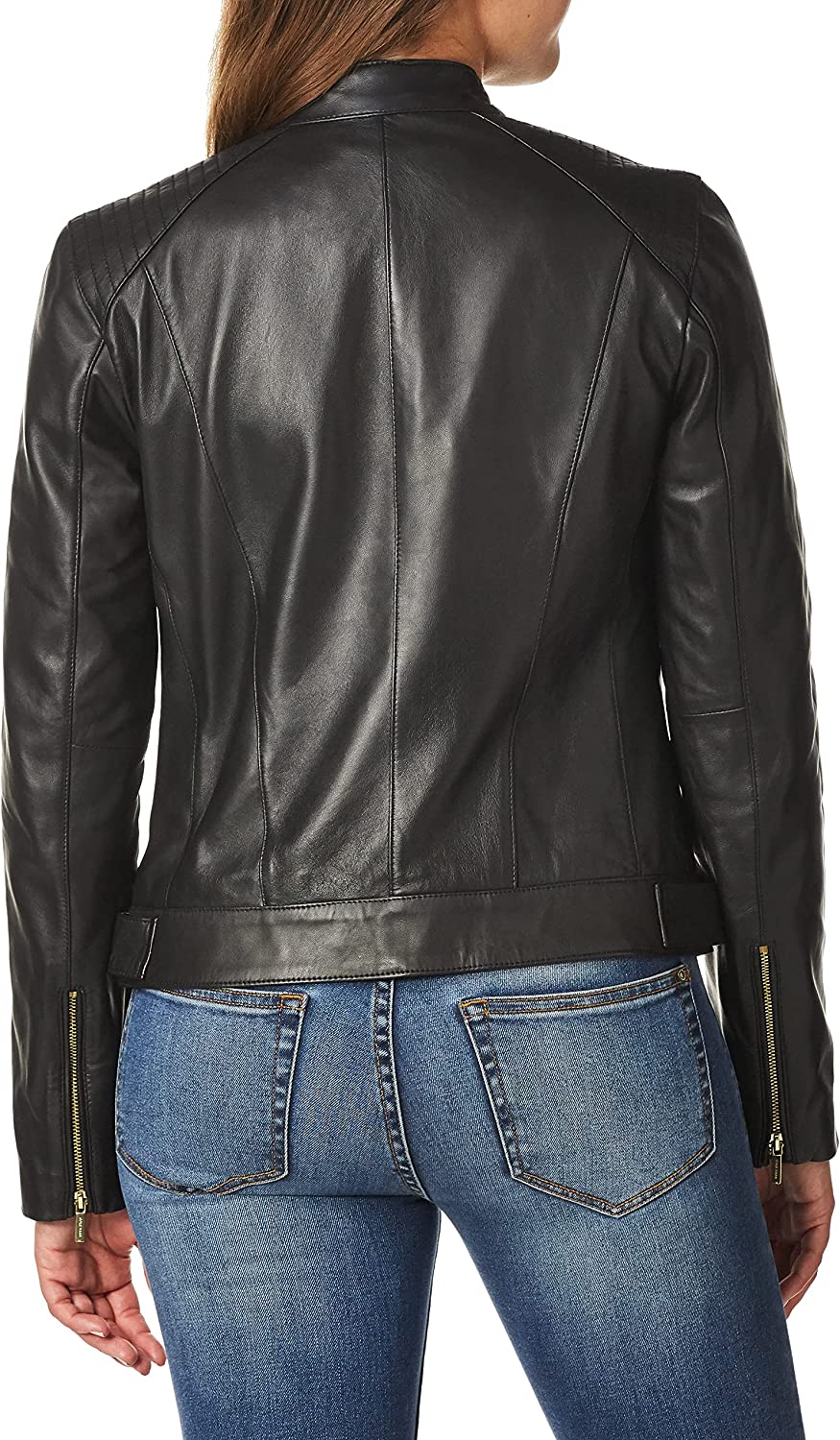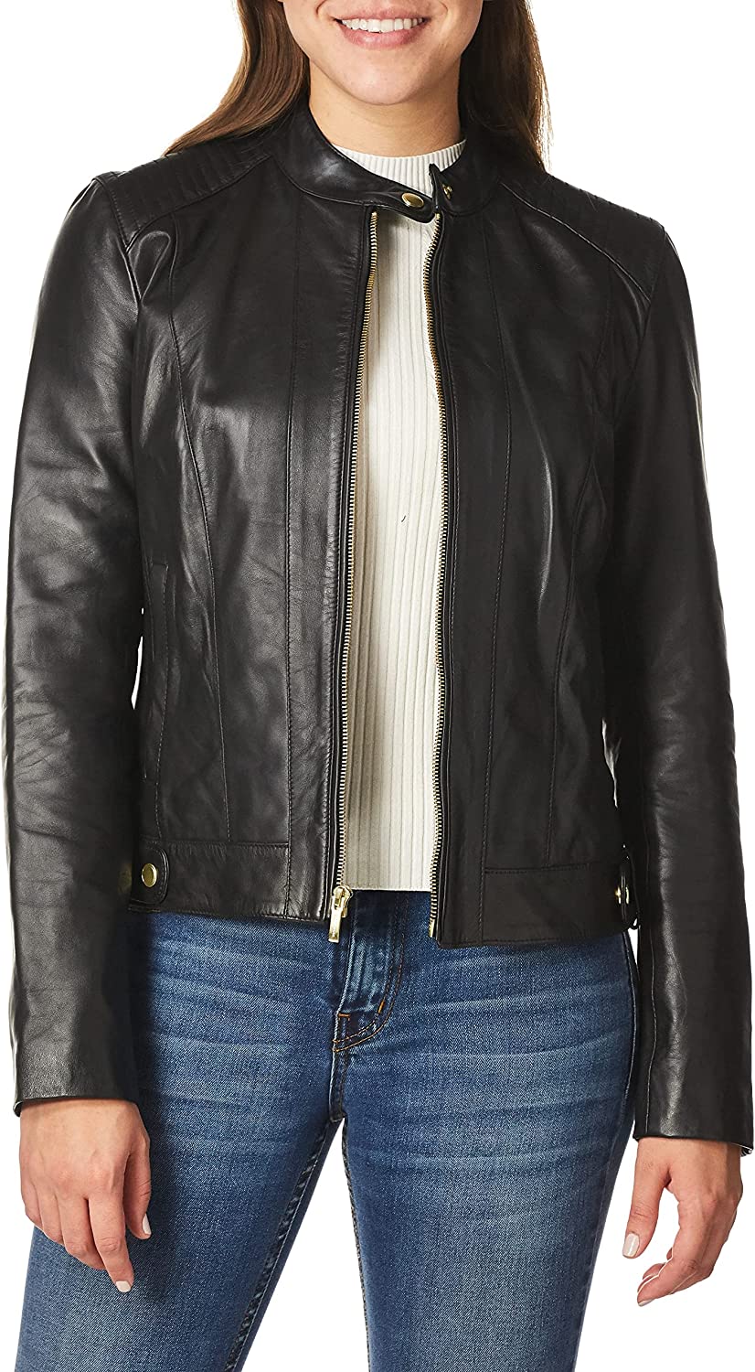Cole Haan Women's Leather Racer Jacket with Quilted Panels