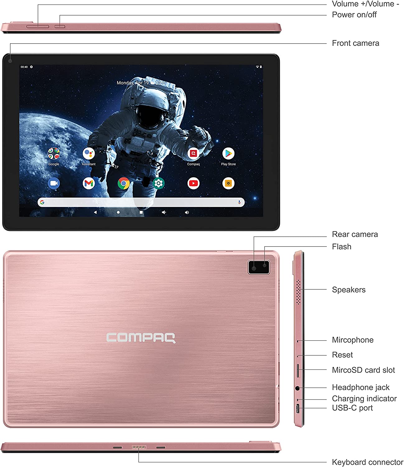 Enjoy compact convenience with the perfectly portable CT201 tablet. Work, watch, and play your favorite games and movies on a sizable 10" screen backed by the easy-to-navigate Android 11 operating system. Includes CT201 tablet with AC adapter, USB charging cable, folio keyboard Android 11 operating system Quad-core processor 10" diagonal Full HD display with 1920x1080 resolution; IPS technology 4GB RAM 64GB Storage 802.11a/b/g/n/ac Wi-Fi 2-megapixel front-facing camera 5-megapixel rear-facing camera with flash USB-C port microSD memory card slot 3.5mm headphone jack Measures approximately 9.84"W x 0.37"D x 6.3"H; 1.22 lbs What You Get *Compaq 10" tablet *Power adapter *USB-C charging cable *Folio keyboard *Detachable kickstand *Manufacturer's 1-year limited warranty