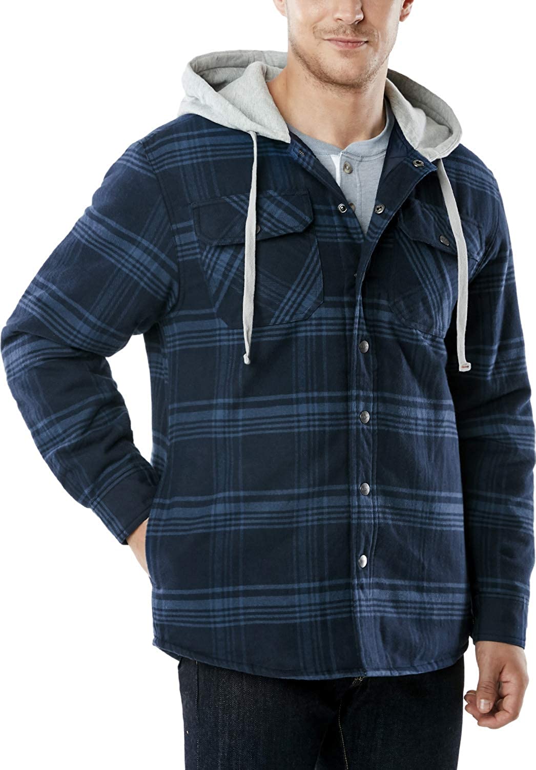 CQR Men's Hooded Quilted Lined Flannel Shirt Jacket, Long Sleeve Plaid Button Up Jackets